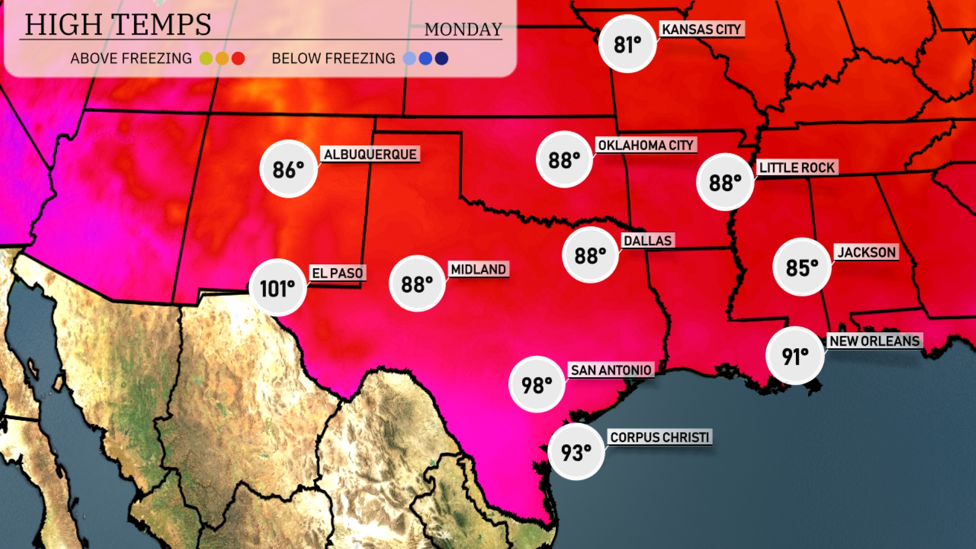 Tomorrow, temperatures soar across the Southern Plains. El Paso will experience a scorching high of 101 degrees, while Midland and Dallas are expected to reach 88 degrees. San Antonio heats up to 98 degrees, and Corpus Christi follows closely at 93 degrees. In the eastern part of the region, New Orleans anticipates a high of 91 degrees, with Jackson not far behind at 85 degrees.