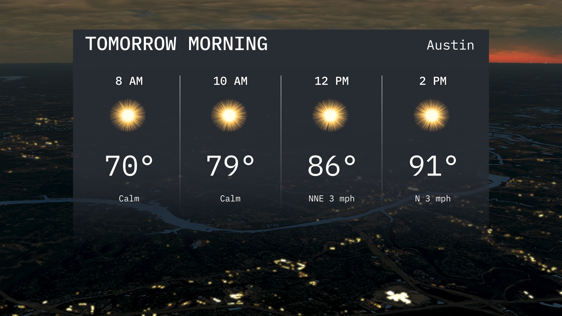 Expect a bright start to the day in Austin with clear skies and calm wind in the morning hours. Temperatures begin at 70 degrees at 8 AM, rising to 79 degrees by 10 AM. You’ll feel a gentle breeze picking up by midday, with winds from the north-northeast. As temperatures continue to climb, it will reach up to 86 degrees by noontime.