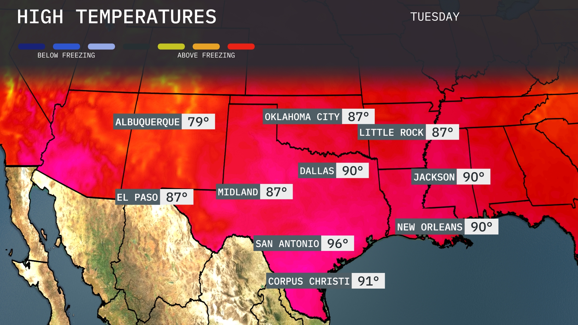 Tomorrow in San Antonio, expect a high of 96 degrees, significantly above average for this time of year. Dallas will also be warm, reaching 90 degrees, while Midland and El Paso will see highs around 87 degrees. Little Rock and Oklahoma City are both forecasted to hit 87 degrees as well, indicating a widespread warm spell across the region. Meanwhile, Corpus Christi is set to reach 91 degrees, contributing to the unseasonably warm trend. Temperatures throughout the Southern Plains will be influenced by a strong ridge of high pressure, keeping skies mostly clear and allowing for ample sunshine.
