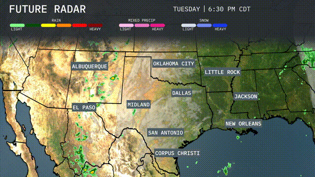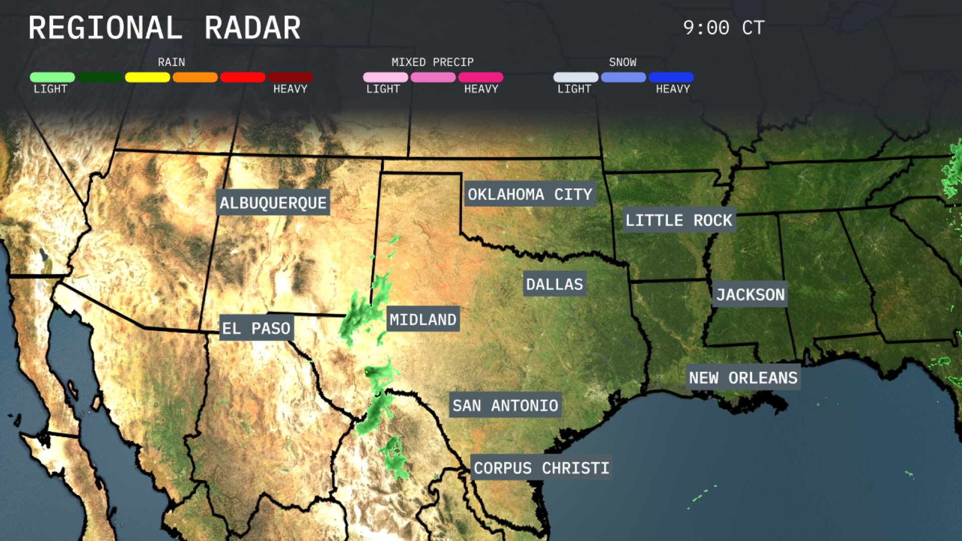 On the Regional Radar, there are scattered showers in the Southern Plains, predominantly impacting areas just west of San Antonio and moving towards Midland. Oklahoma City and Dallas remain dry with overcast skies. Light rain is touching parts of west Texas, towards El Paso. A calm pattern is maintaining clear conditions over Little Rock and Jackson.