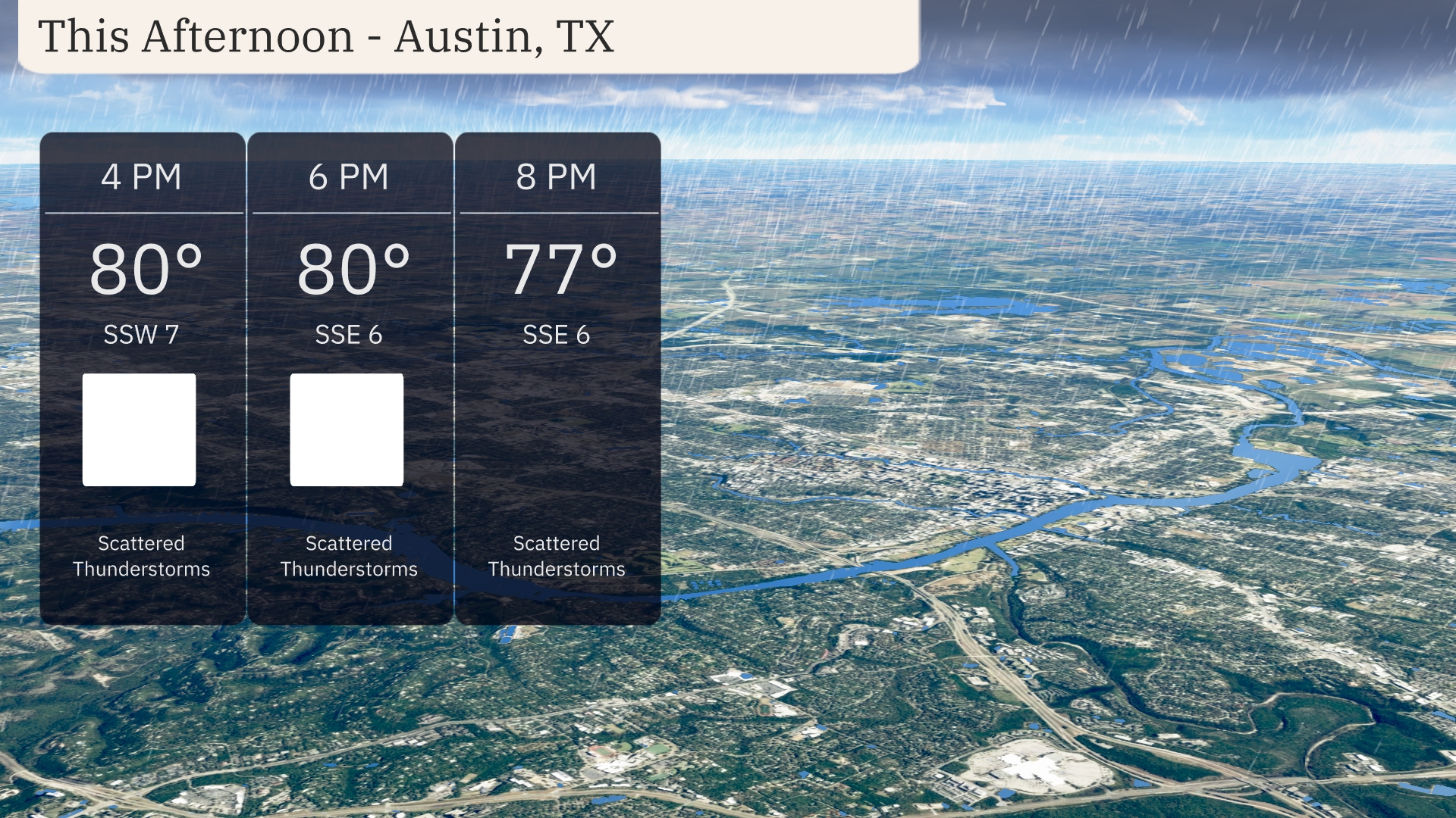This afternoon in Austin, temperatures will remain steady around 80 degrees with scattered thunderstorms expected. Winds will be from the south-southwest at 7 miles per hour initially, shifting to 6 miles per hour from the south-southeast by 6 PM. Thunderstorms might bring some relief, but keep an umbrella handy if you’re out and about. Temperatures drop slightly to 77 degrees by 8 PM as showers continue.