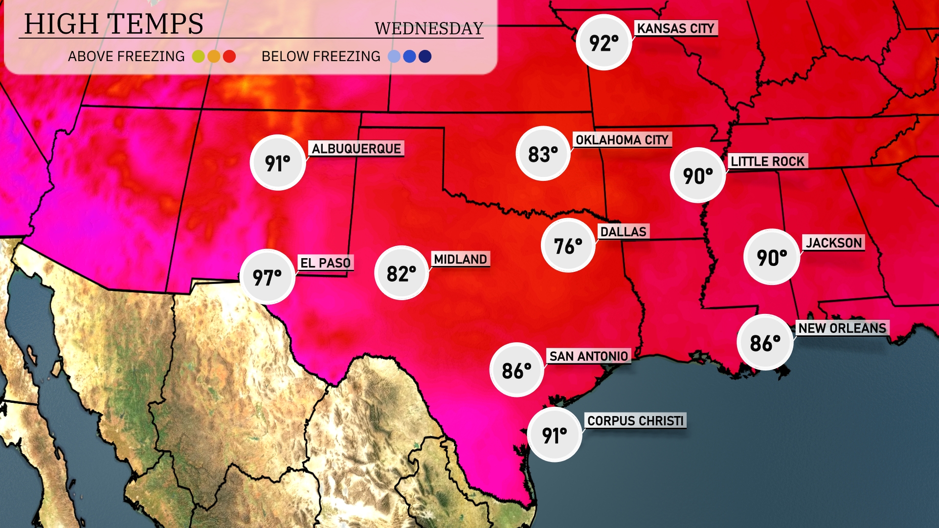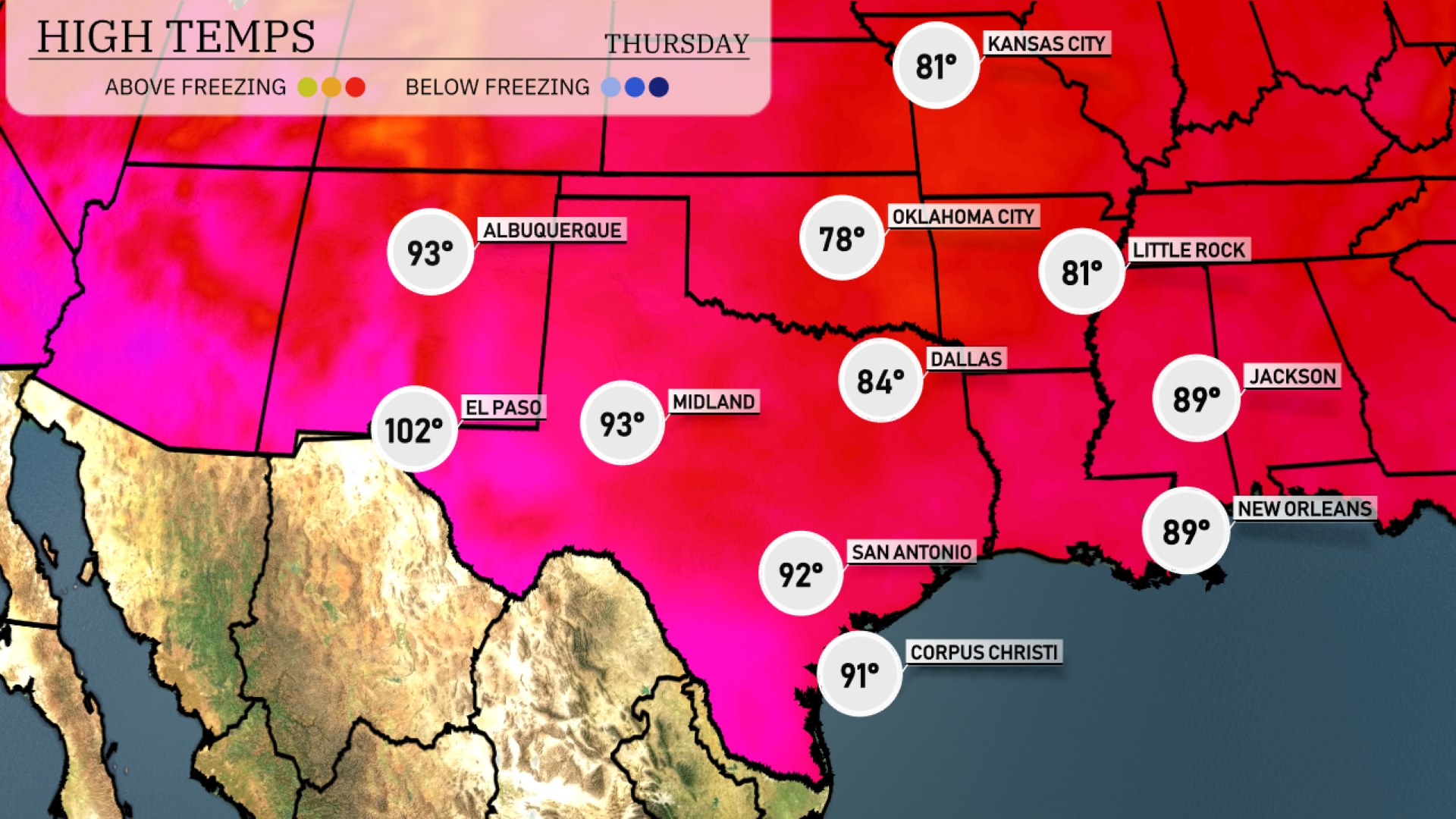 Tomorrow in El Paso, expect a scorching high of 102 degrees, well above average for this time of year. Midland will also feel the heat with a high reaching 93 degrees. San Antonio is set for a warm day at 92 degrees, while Corpus Christi will see a high of 91. Dallas will experience a more moderate temperature of 84 degrees, with Oklahoma City slightly cooler at 78. New Orleans and Jackson are likely to feel the warmth as well, both anticipating highs around 89 degrees.