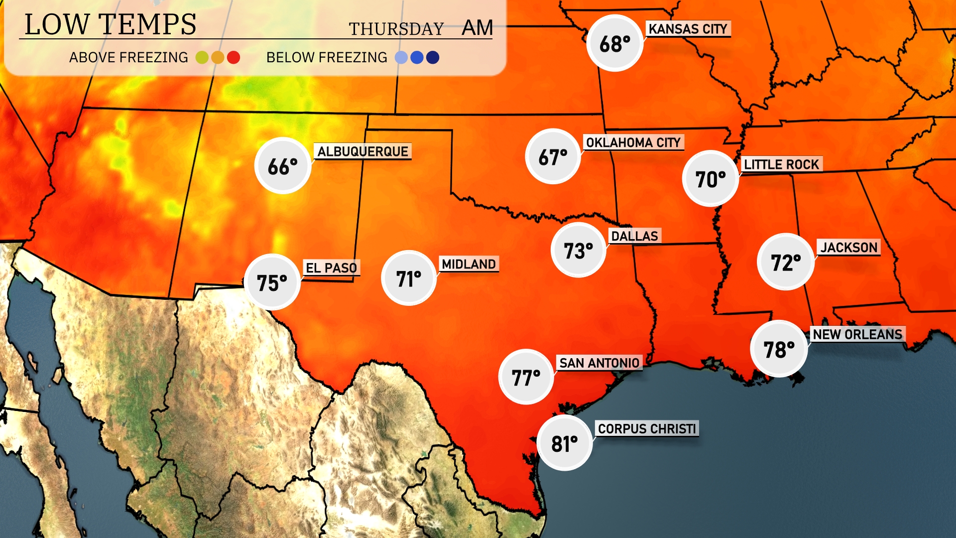 Tonight in the Southern Plains, Dallas will drop to a low of 73 degrees, while Midland cools to 71. Expect San Antonio to see a mild low of 77, with similar temperatures in New Orleans at 78. Los Alamos will cool to 66 degrees.