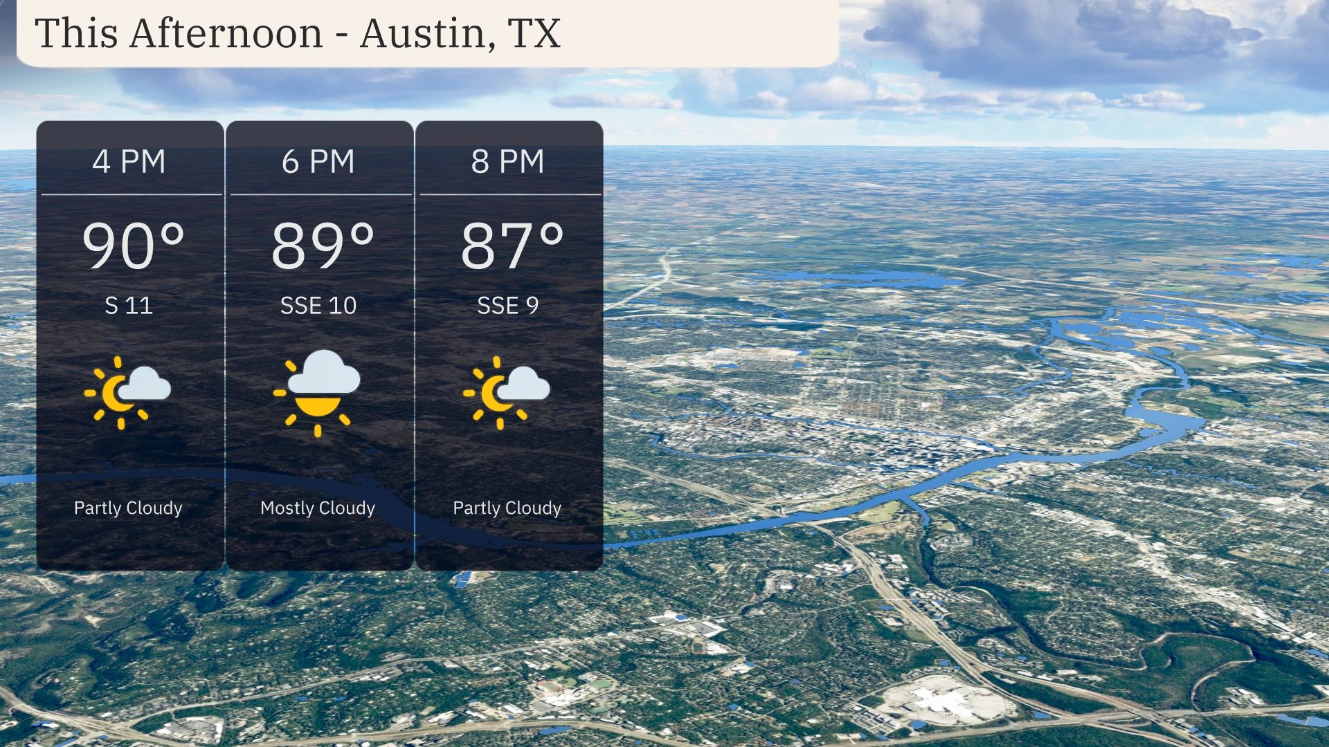 In Austin this afternoon, temperatures will hover around 90 degrees at 4 PM with a south wind at 11 miles per hour. By 6 PM, expect temperatures to slightly drop to 89 degrees and wind to shift slightly to the south-southeast at 10 miles per hour with mostly cloudy skies. At 8 PM, partly cloudy conditions will continue as temperatures ease down to 87 degrees with the south-southeast wind at 9 miles per hour. Ideal conditions for a warm and breezy evening in the city.