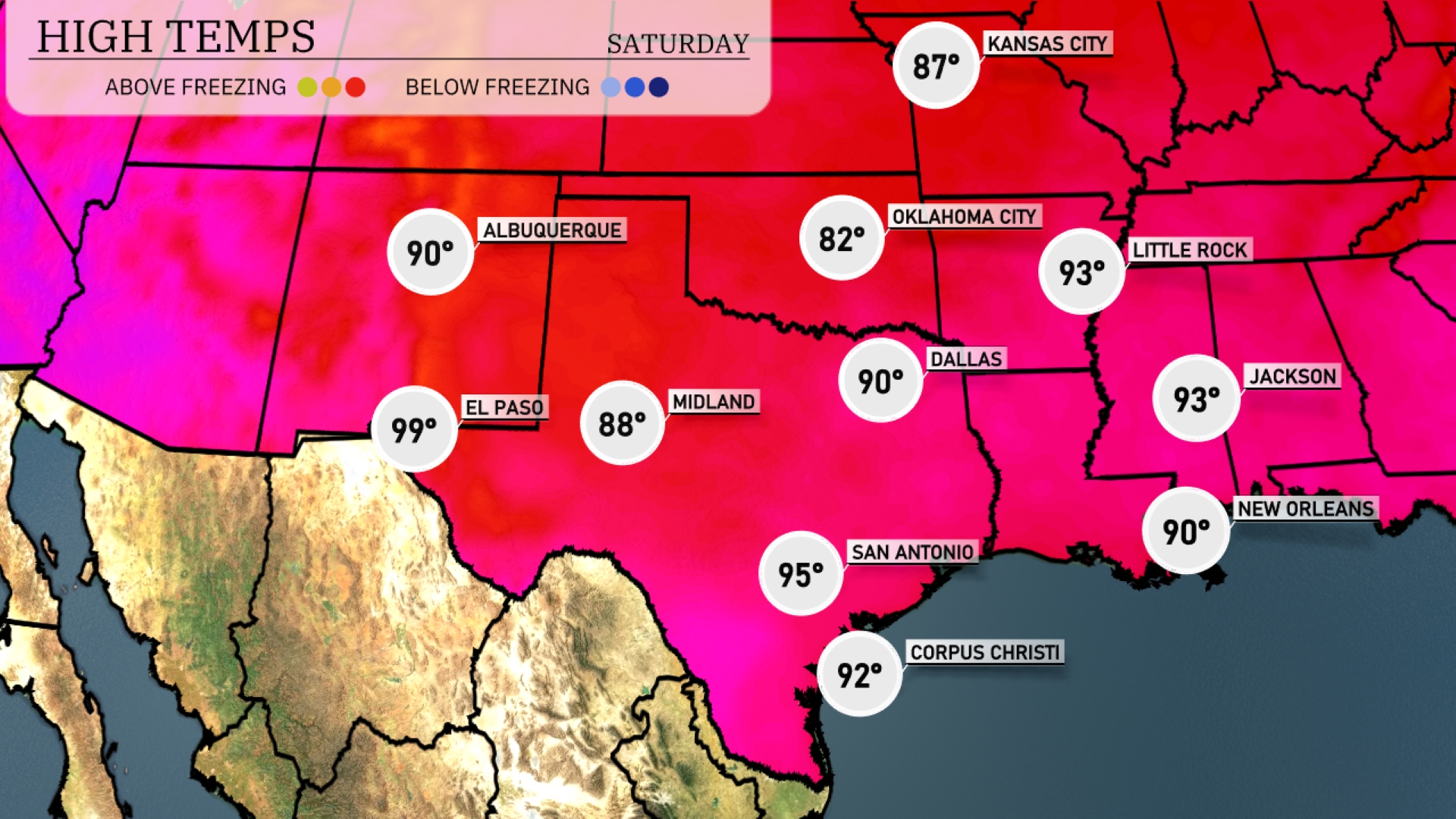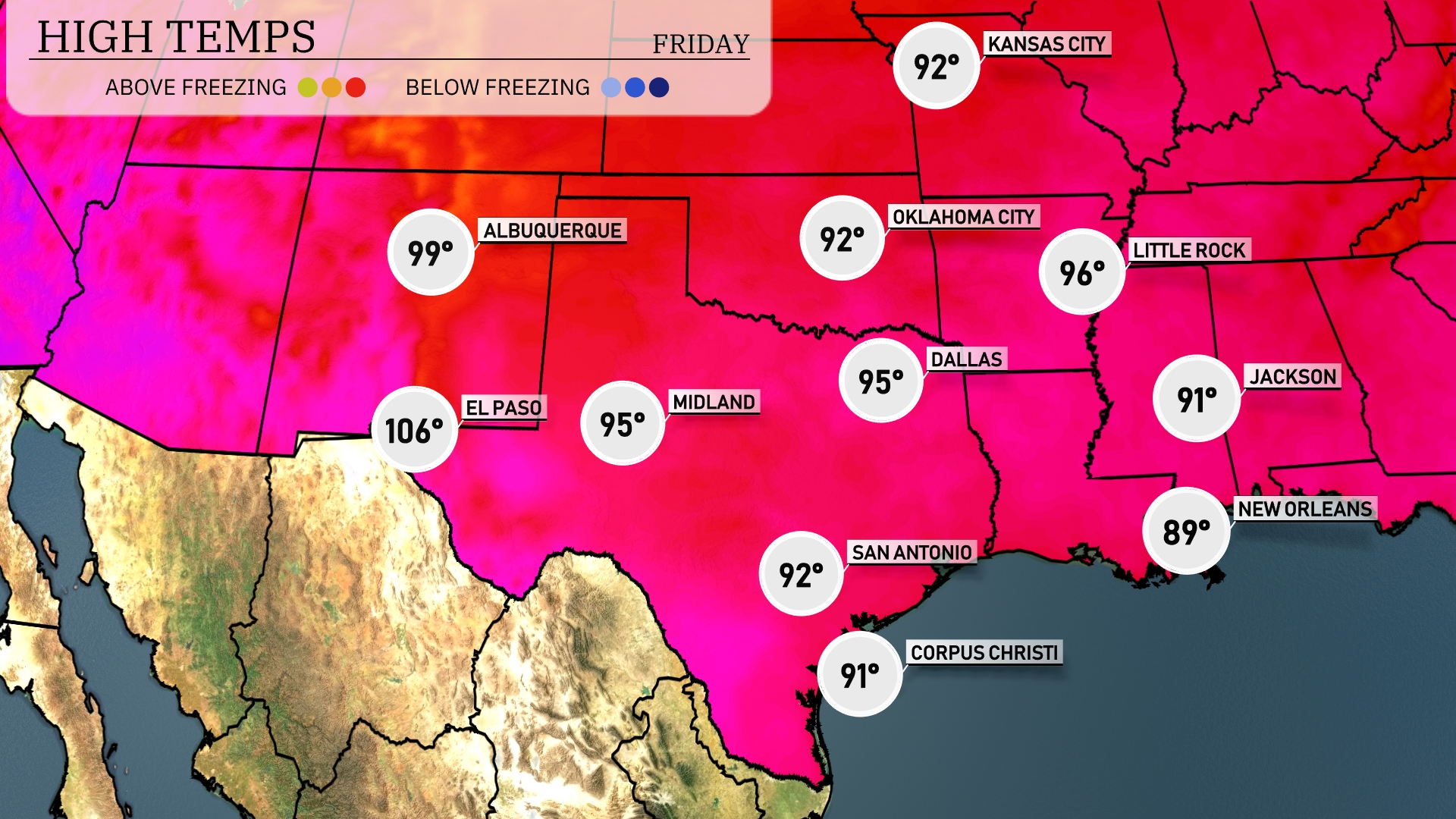 Tomorrow in El Paso, expect a high of 99 degrees, while Midland will reach a warm 88. San Antonio is sizzling at 95 degrees, and Corpus Christi will hit 92. Dallas is also warm at 90 degrees, whereas Little Rock anticipates a high of 93. Overall, temperatures across the Southern Plains are trending above average, driven by a persistent warm air mass influencing the region.