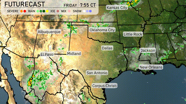 The Southern Plains are fairly quiet with a few areas of attention. Showers are light but persistent near Albuquerque, gradually moving southward. Another pocket of rain is developing south of El Paso, stretching towards Midland with some cloud cover. Areas like Dallas and Little Rock are enjoying clear skies, whereas Corpus Christi is seeing clouds build in, hinting at potential showers.
