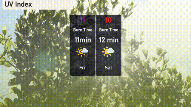 The UV index in Austin on Friday will reach an extreme level of 11, with a burn time of only 11 minutes, so protective measures are crucial. For Saturday, the UV index slightly decreases to 10, yet the sun remains intensely strong with a burn time of 12 minutes—stay protected!