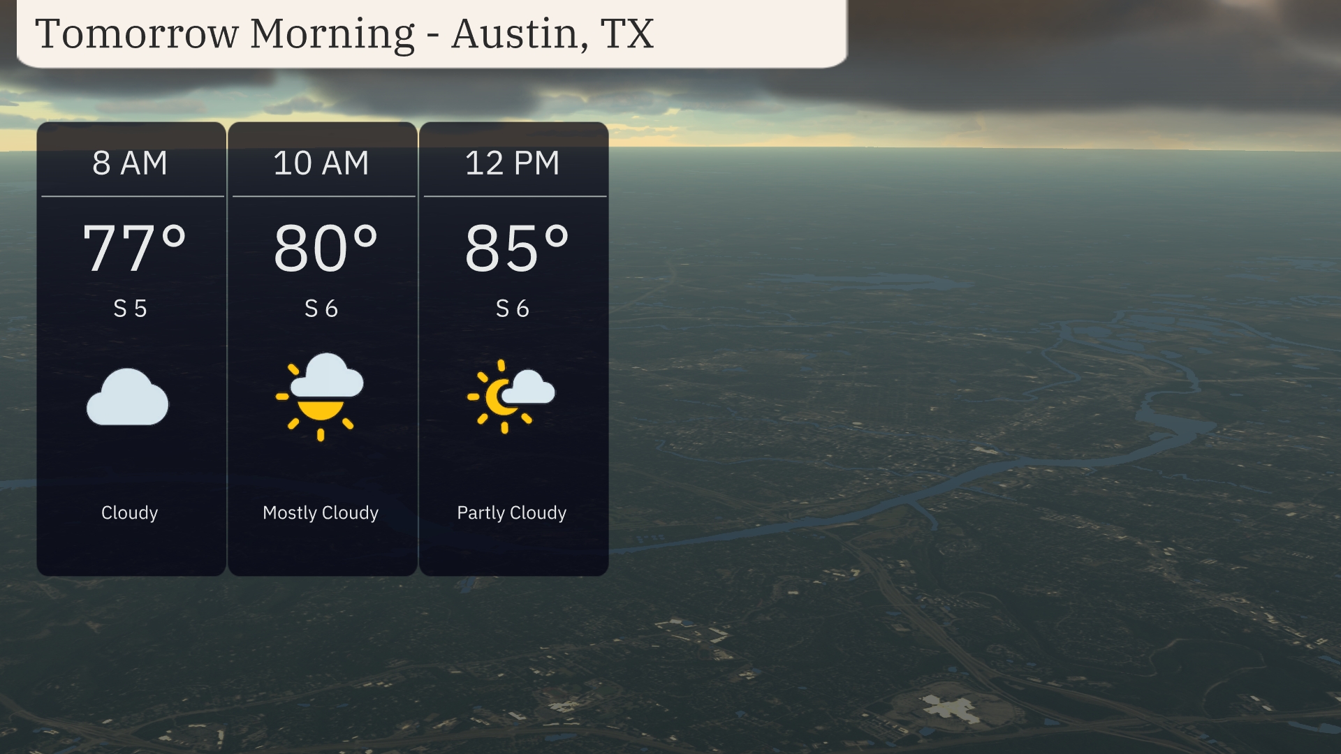 For Tomorrow Morning in Austin, temperatures begin at 77 degrees at 8 a.m. with cloudy skies and a light breeze from the south at 5 mph. By 10 a.m., temperatures rise to 80 degrees as clouds begin to clear, transitioning to mostly cloudy skies with a slight increase in wind speed to 6 mph. Toward noon, expect partly cloudy conditions as temperatures climb to 85 degrees, with winds continuing from the south at 6 mph.