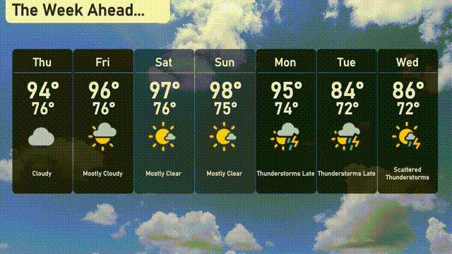 Friday: Mostly cloudy with a high of 96 degrees and a low of 76 degrees.