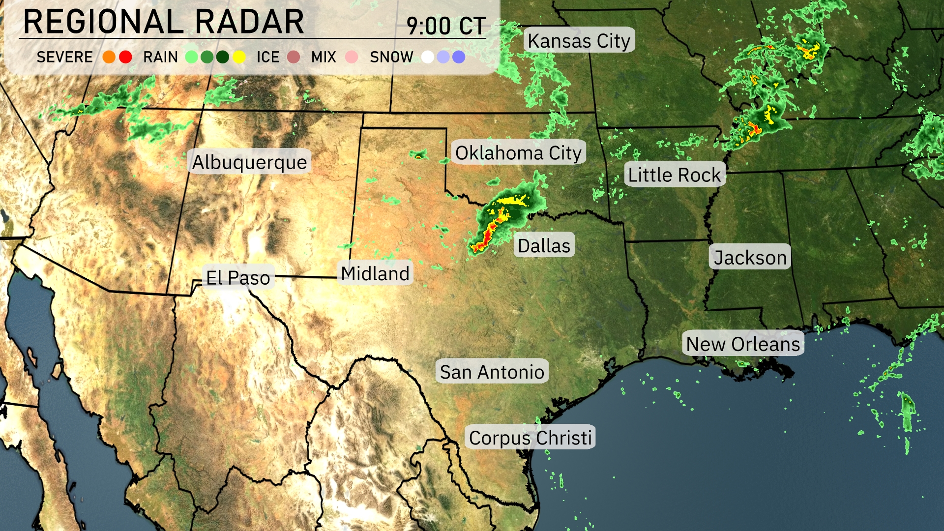 On the Regional Radar, a line of thunderstorms is moving through central Texas, heading towards Dallas. These storms are stretching from southwest of Oklahoma City down to the northeast of San Antonio, with some heavy rain and potential severe weather in the mix. To the east, Little Rock is under cloud cover with a chance of isolated showers. Light precipitation is present near Corpus Christi, with mostly clear conditions over Albuquerque and Midland. Kansas City and New Orleans are experiencing clear skies at the moment.