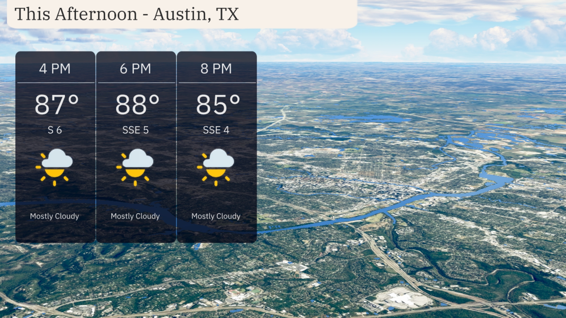 Afternoon temperatures in Austin reach up to 88 degrees with a mostly cloudy sky. A mild breeze from the south to southeast at around 5 mph keeps the air moving. Cloud cover provides a little relief from direct sunlight, although it’s still warm. Temperatures ease slightly to 85 degrees by 8 PM as the wind calms to 4 mph.