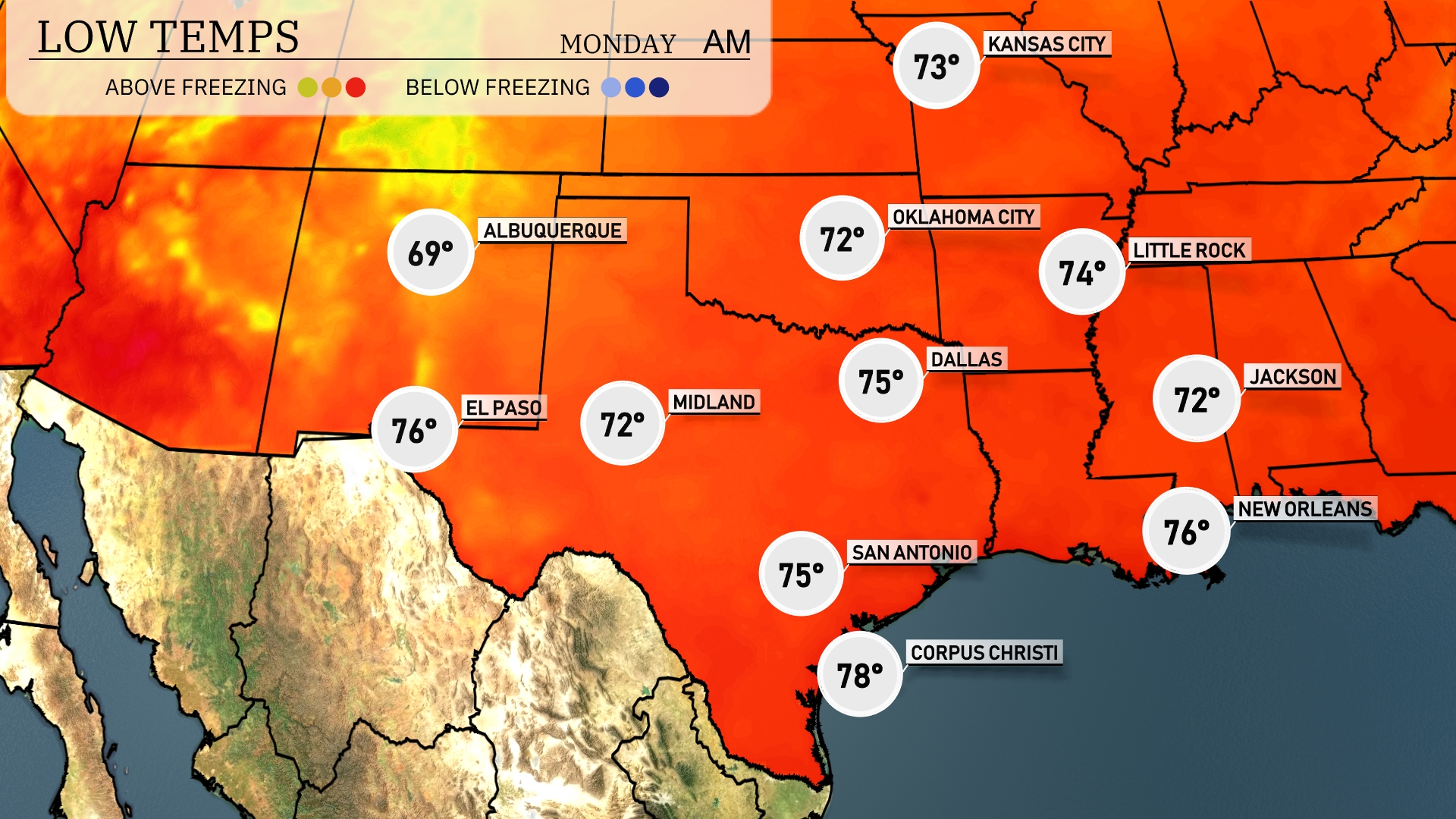 Tonight, Dallas will cool down to 75 degrees, while San Antonio will also experience a low of 75. Expect a mild night in Austin at 76 degrees, with New Orleans dropping slightly to 76 as well. Meanwhile, Corpus Christi will remain warm at 78 degrees, marking one of the higher overnight lows in the region.