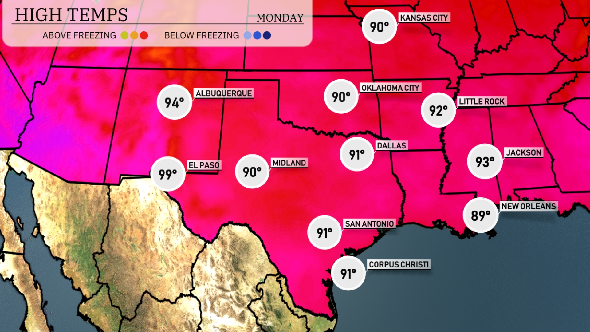 Tomorrow, El Paso will reach a scorching 99 degrees, while Midland will see a high of 90. San Antonio is expected to hit 91 degrees, and Dallas will warm up to 91 as well. In Jackson, highs will be around 93 degrees, with New Orleans slightly cooler at 89. Overall, many areas in the Southern Plains are trending above average as high pressure influences warmer temperatures across the region.