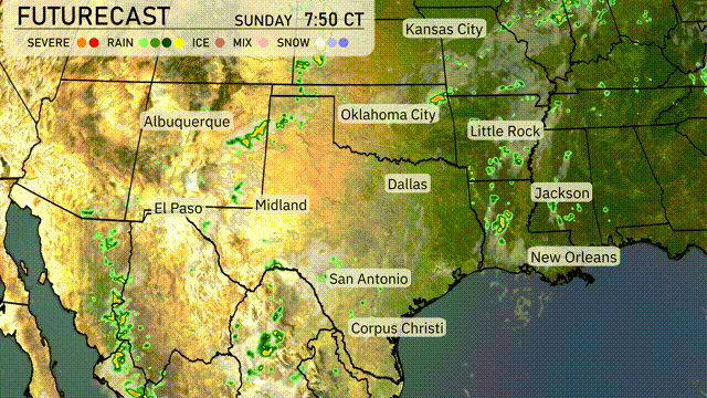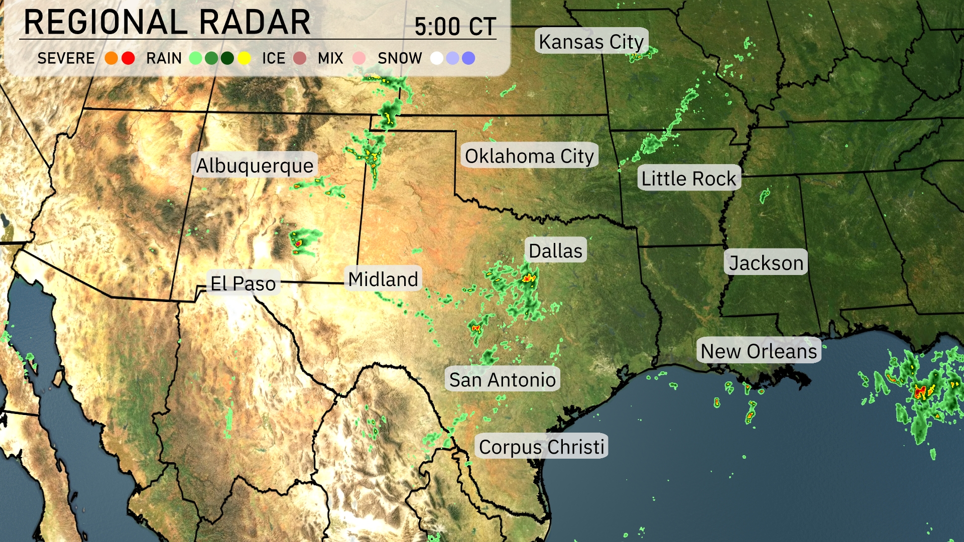 On the Regional Radar, there’s a scattered cluster of rain showers stretching from Midland to San Antonio, moving northeastward. Dallas is currently experiencing light rain, with some potential for isolated thunderstorms. Meanwhile, showers are also developing near the southern border of Oklahoma, tracking towards Oklahoma City. Areas like New Orleans are seeing increasing cloud cover as moisture gathers in the Gulf.