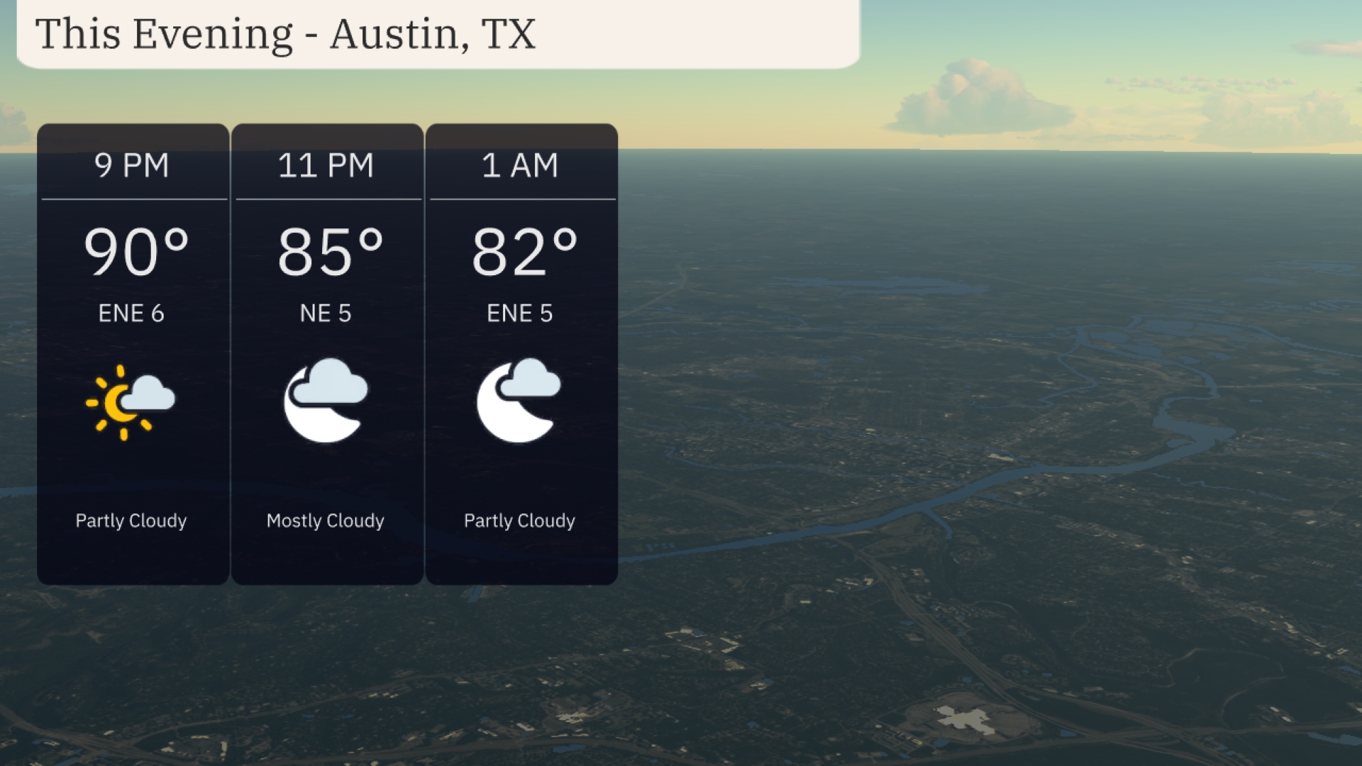 For this evening in Austin, enjoy a partly cloudy sky with temperatures starting at 90 degrees at 9 PM. By 11 PM, temperatures will ease to 85 degrees, with mostly cloudy conditions taking over. Expect a gentle breeze, with the wind shifting slightly from east-northeast at 6 miles per hour to east-northeast at 5 miles per hour by midnight. Temperatures continue to dip to 82 degrees at 1 AM under partly cloudy skies.