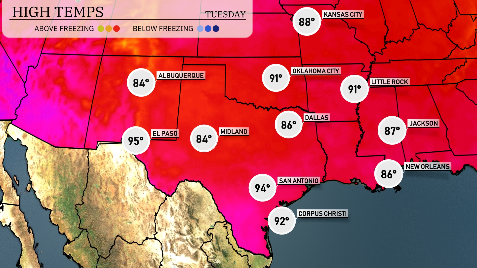 Tomorrow, El Paso is set to sizzle with a high of 95 degrees, showcasing a continued warm trend for the area. Midland will see slightly cooler temperatures at 84 degrees. In San Antonio, expect a steamy high of 94 degrees, while Corpus Christi will reach 92 degrees. Dallas will share similar warmth at 86 degrees, and Little Rock anticipates reaching a high of 91 degrees.
