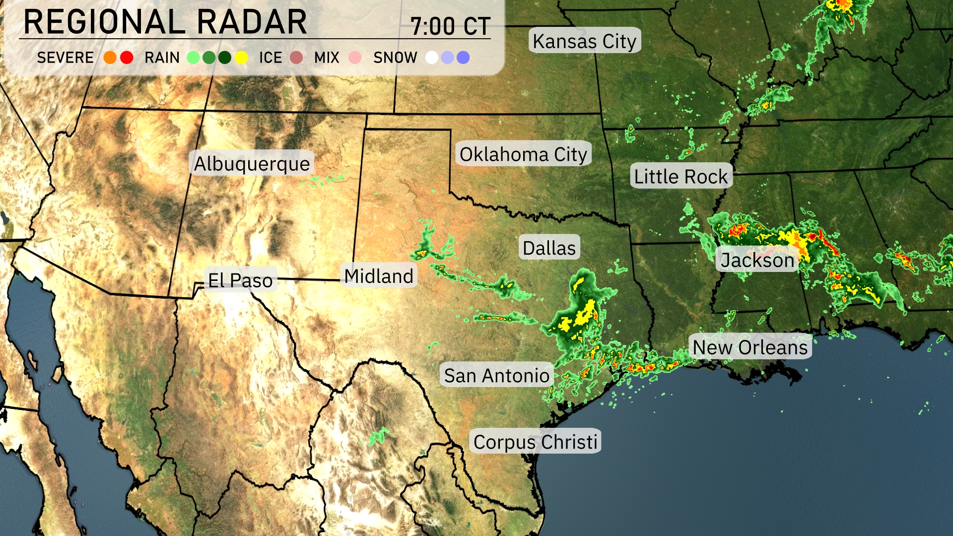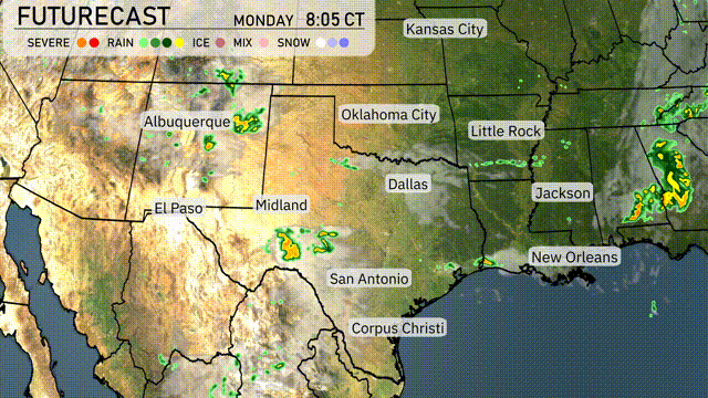 Tonight Dallas will hover around 71 degrees, while San Antonio sits slightly warmer at 73. Expect a low of 68 in Little Rock and 67 in Oklahoma City. El Paso will cool down to 69 degrees, maintaining a pleasant evening across the region.