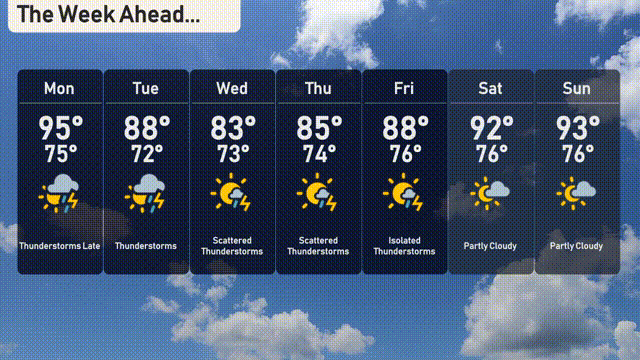 Monday: Expect thunderstorms late with a high of 95 degrees and a low of 75 degrees.