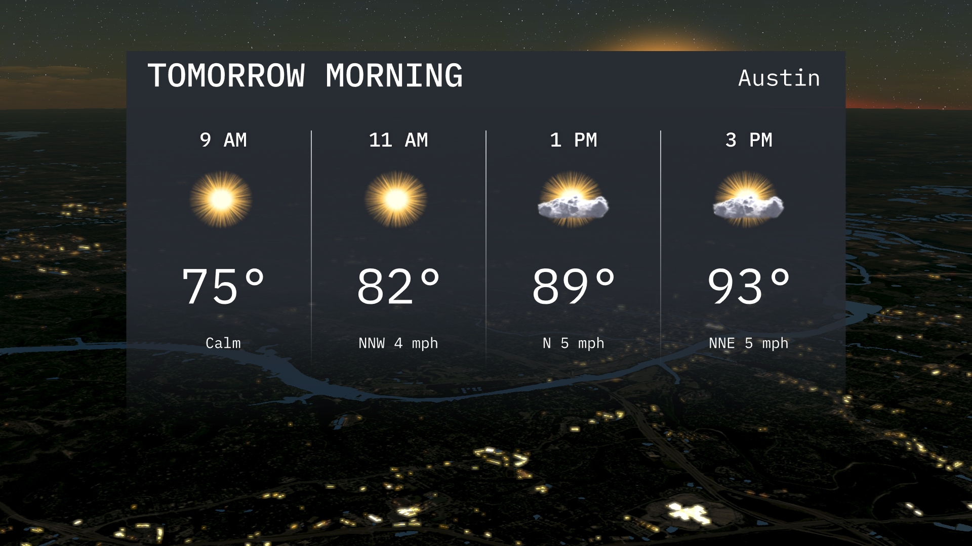Austin’s weather for tomorrow morning sees a sunny start with temperatures around 75 degrees at 9 a.m. A light northwest wind will accompany the clear skies. By 11 a.m., temperatures warm to 82 degrees.