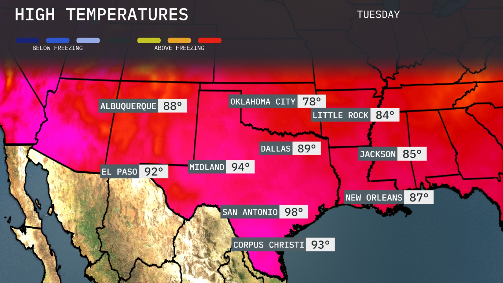 Tomorrow in El Paso, expect a high of 92 degrees, while Midland warms up even more to 94. In San Antonio, temperatures will soar to a sweltering 98 degrees, making it notably above average for this time of year. Dallas is also experiencing warm conditions, reaching 89 degrees, with Oklahoma City seeing a cooler high of 78. Corpus Christi rounds out the Southern Plains forecast with a high of 93 degrees, maintaining the summer heat across the region.