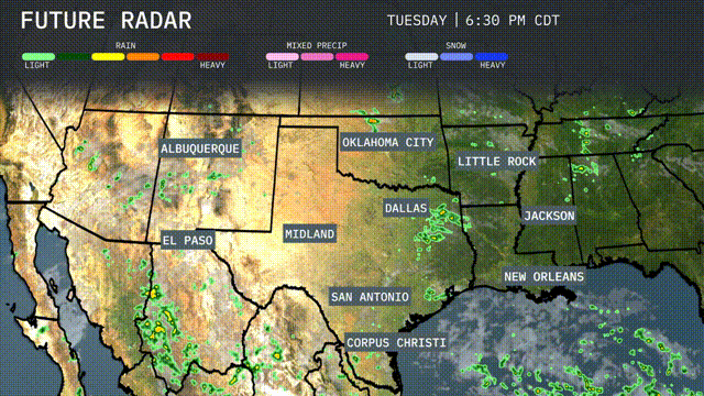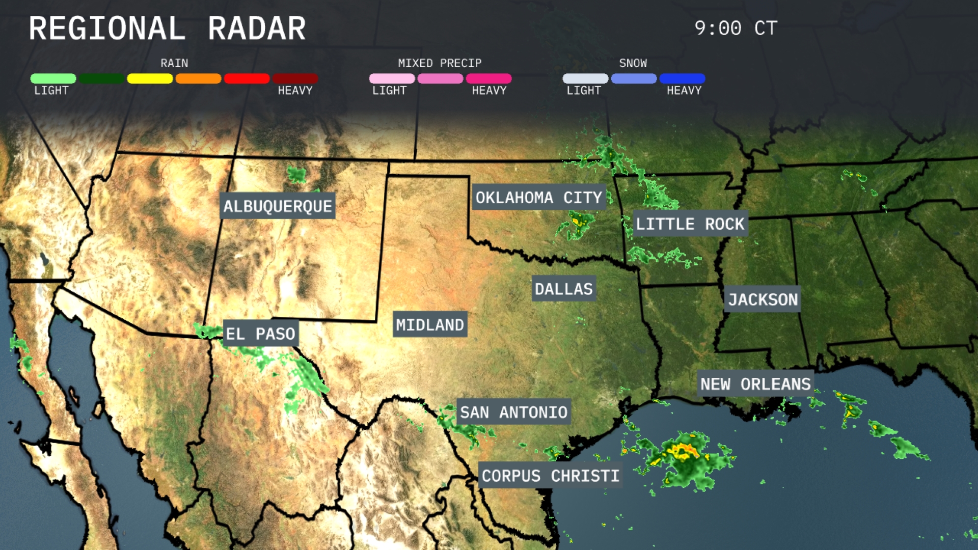 On the Regional Radar for the Southern Plains, showers are forming around El Paso and spreading eastward towards midland under partly cloudy skies. Oklahoma City is experiencing scattered rain showers extending into Little Rock with some heavier pockets. Meanwhile, New Orleans is dealing with light rain offshore, while Corpus Christi sees isolated showers creeping in from the Gulf. The rest of the area, including Dallas and Albuquerque, remains dry with no significant cloud coverage.
