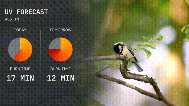 The UV index in Austin today is high, with a value indicating a burn time of about 17 minutes. Tomorrow, the UV index remains elevated, with a burn time decreasing to 12 minutes. Protect your skin with sunscreen and hats if you plan outdoor activities!