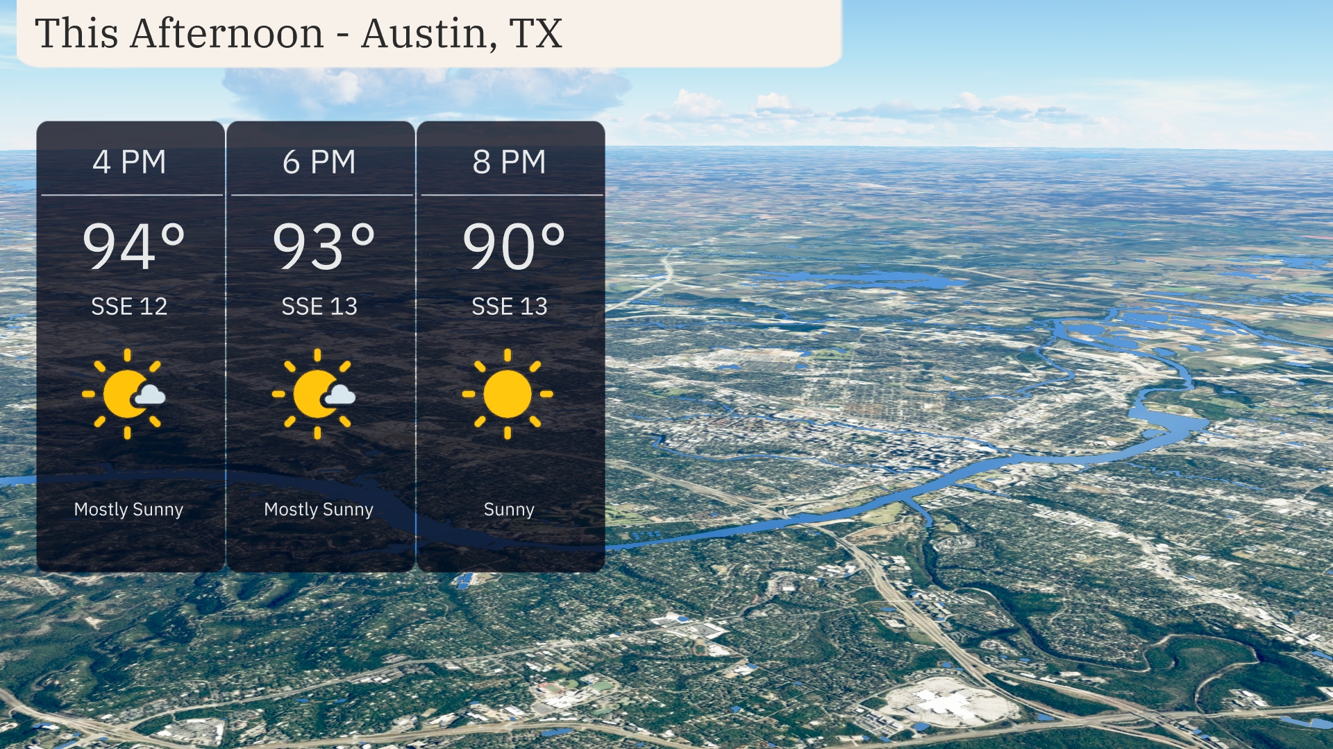 Afternoon temperatures in Austin will reach up to 94 degrees with mostly sunny skies. A southeast wind at 13 miles per hour will provide a bit of a breeze. Conditions will remain fairly consistent into the evening, dropping slightly to 90 degrees by 8 PM with clear skies.