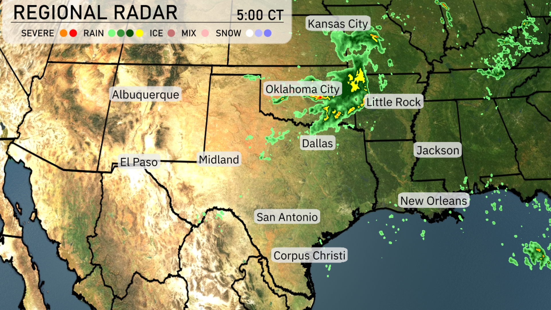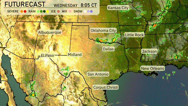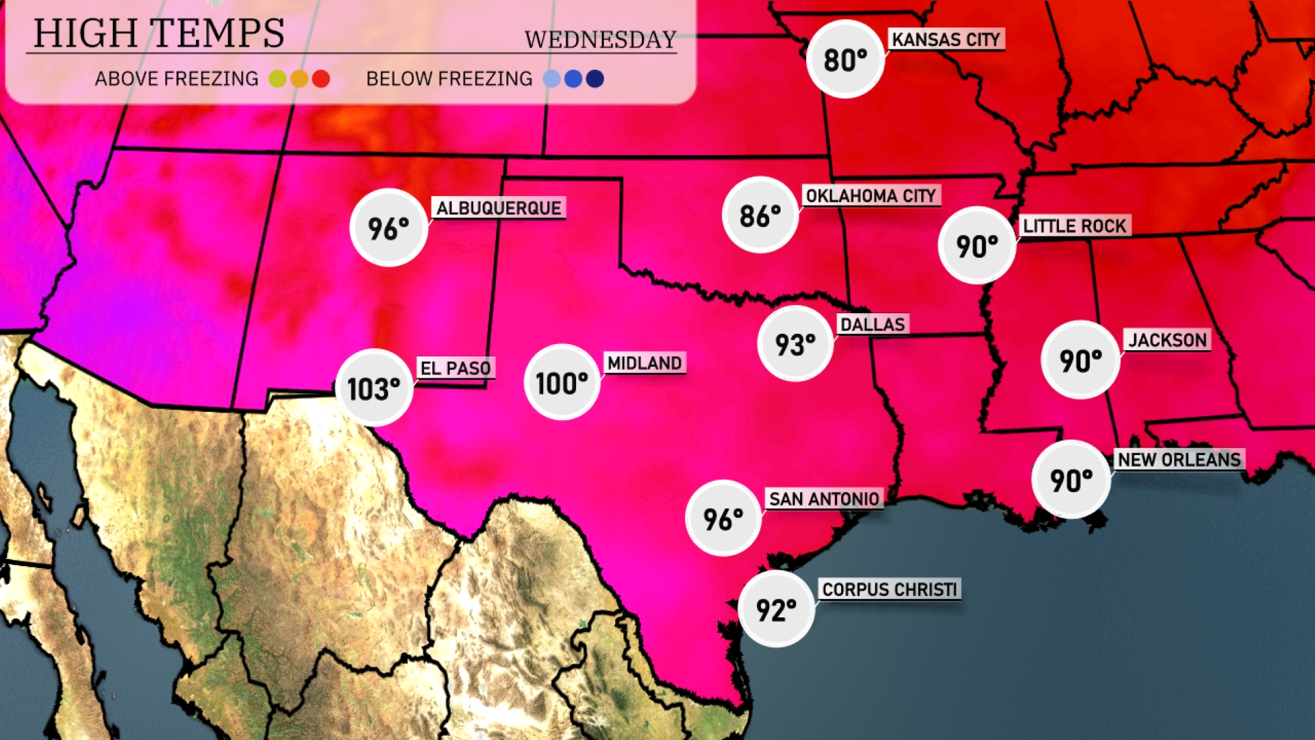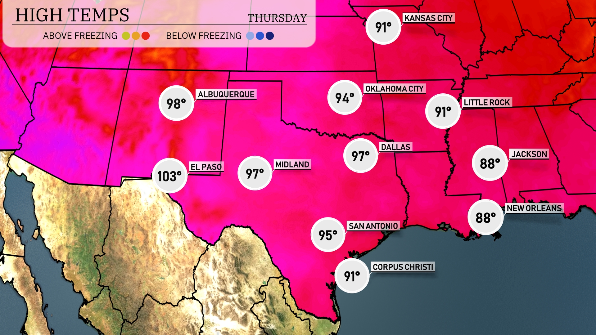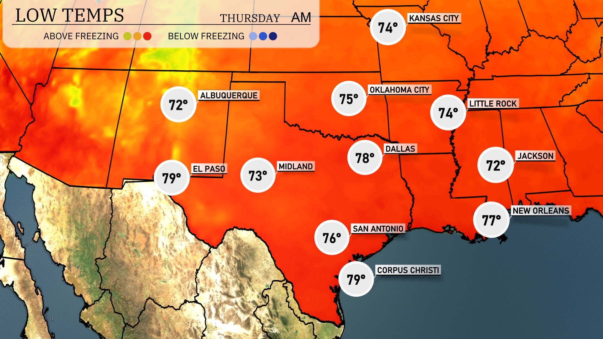 Tonight, Dallas is expected to drop to 78 degrees, while Midland will cool down to 73. In Oklahoma City, temperatures will settle at 75 degrees, and Little Rock will see a low of 74.