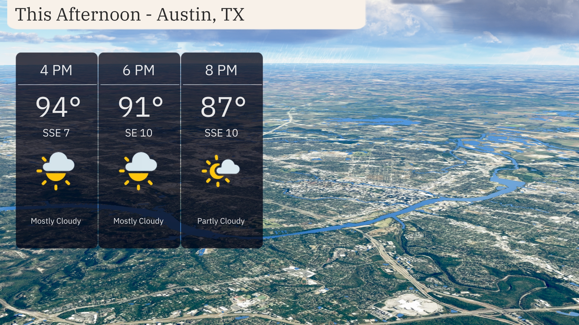 Austin temperatures this afternoon start at 94 degrees at 4 PM, dipping to 91 degrees by 6 PM. Winds are coming from the south-southeast at 7 to 10 mph. Mostly cloudy skies will dominate through the early evening, transitioning to partly cloudy conditions by 8 PM with temperatures around 87 degrees.