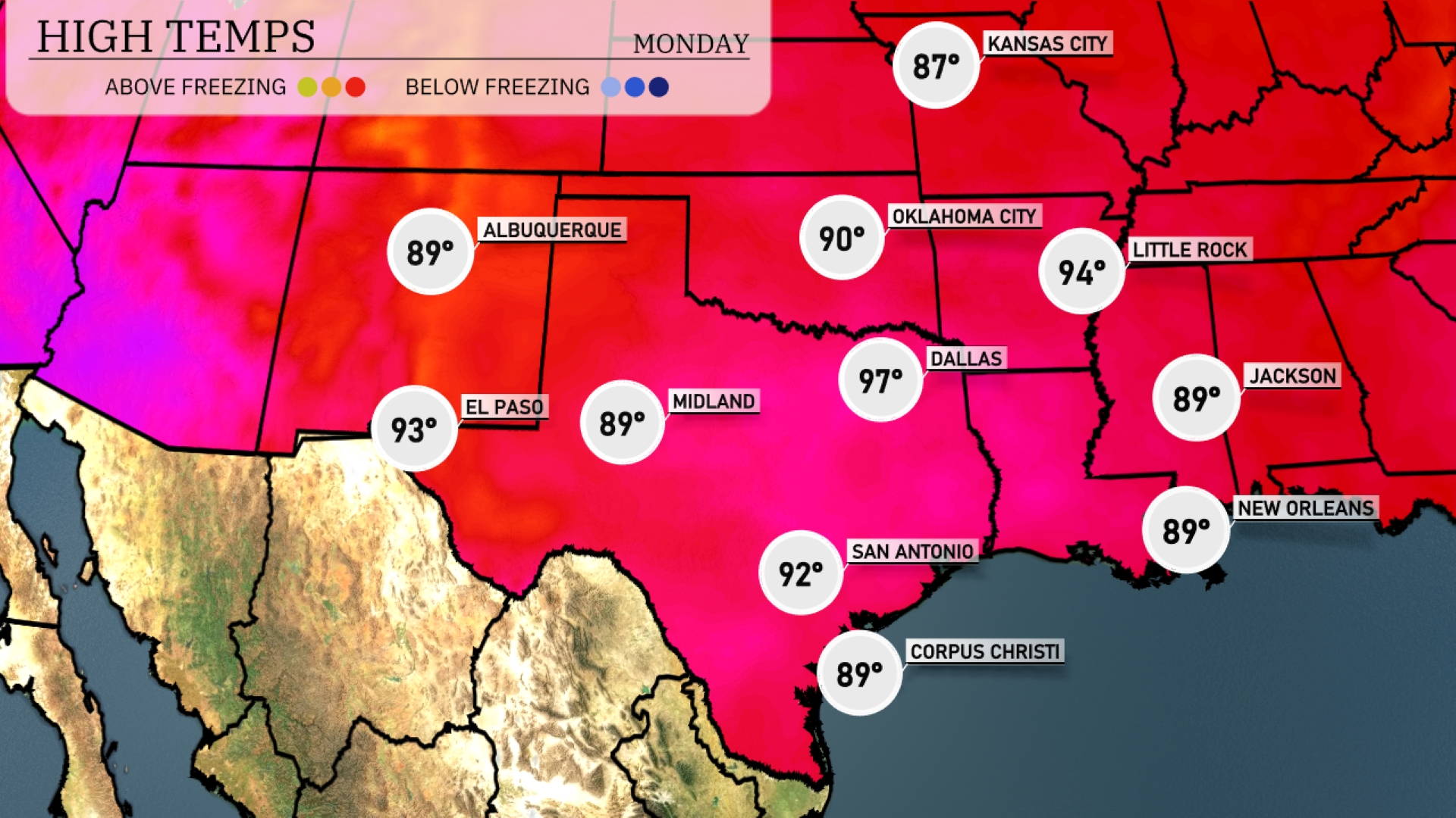 Afternoon highs across the Southern Plains are sizzling today. In El Paso, expect a high of 97 degrees, while Midland also sees similar heat with a high of 96. Dallas will warm up to 96 degrees, bringing a hot day to the area. San Antonio is slightly cooler at 92 degrees, with a bit of relief from the higher temps. In contrast, New Orleans is experiencing more moderate conditions with a high of 87 degrees, making it a more pleasant day by the Gulf.