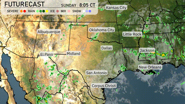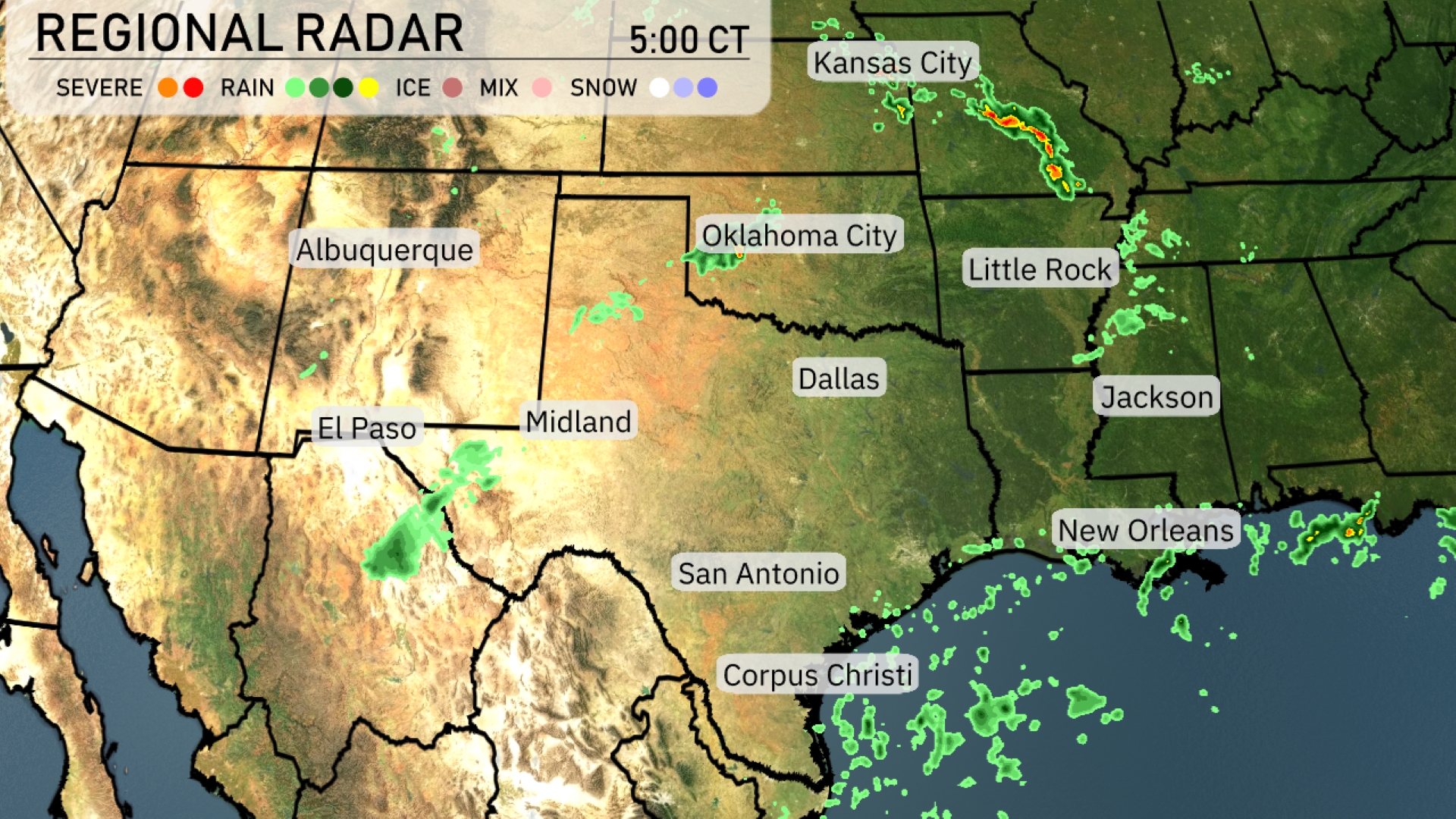 A line of severe storms is advancing through the Southern Plains, moving across southern Kansas towards Kansas City. Light rain showers are noted in central Texas near Midland, moving eastward. Scattered showers can also be seen moving east near Jackson, Mississippi, and extending out towards New Orleans. Meanwhile, areas like El Paso and San Antonio enjoy drier, clearer conditions under calm skies.