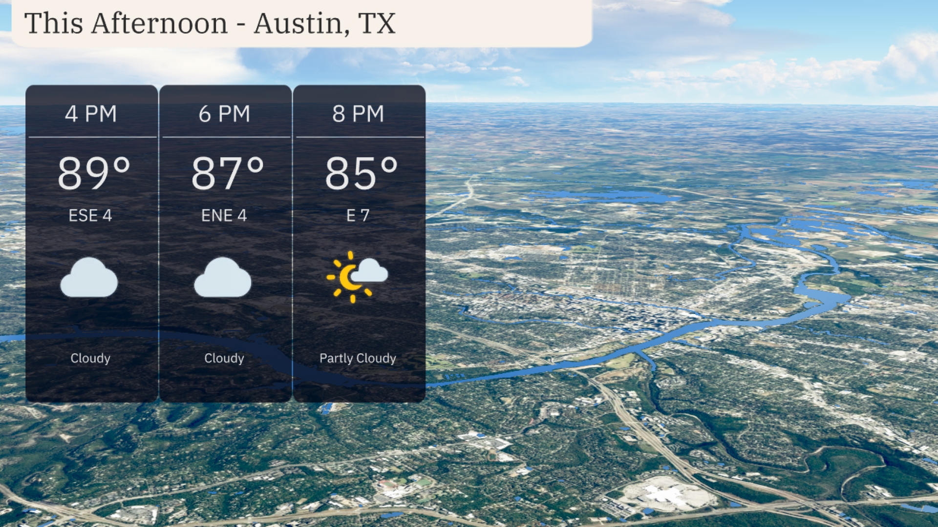 Temperatures in Austin this afternoon will reach up to 89 degrees around 4 PM, with mostly cloudy skies. Expect a light east-southeast wind at 4 miles per hour, shifting to east-northeast by 6 PM as temperatures dip slightly to 87 degrees. By 8 PM, partly cloudy conditions will emerge, with temperatures cooling to 85 degrees and a light easterly breeze.