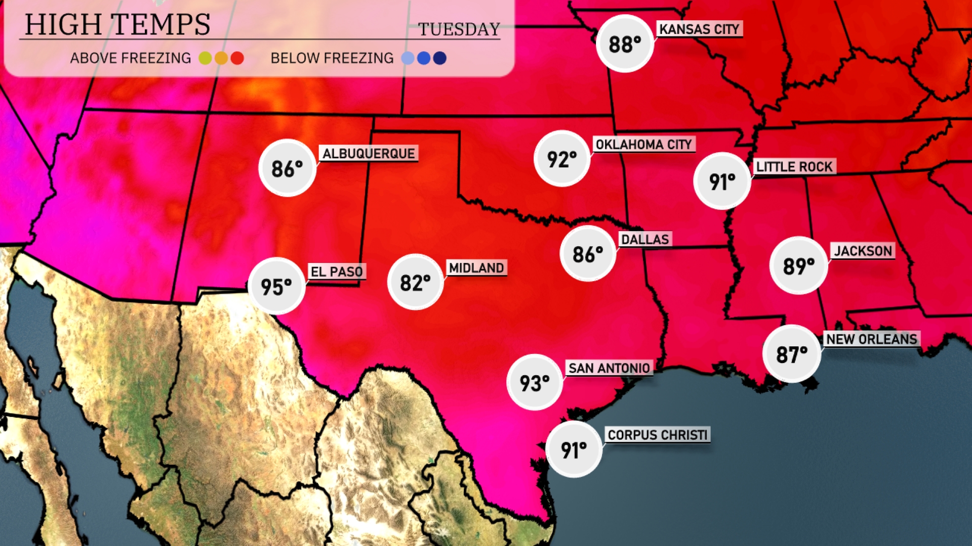 Today, we’re seeing some warm temperatures across the Southern Plains. In El Paso, we’re expecting a high of 95 degrees, while Midland will be a bit cooler at 82. San Antonio is on the warmer side with a high of 93. Dallas is sitting at 86 degrees, and Little Rock will reach 91. Jackson has a pleasant day ahead with a high of 89, and New Orleans is coming in slightly cooler at 87 degrees.