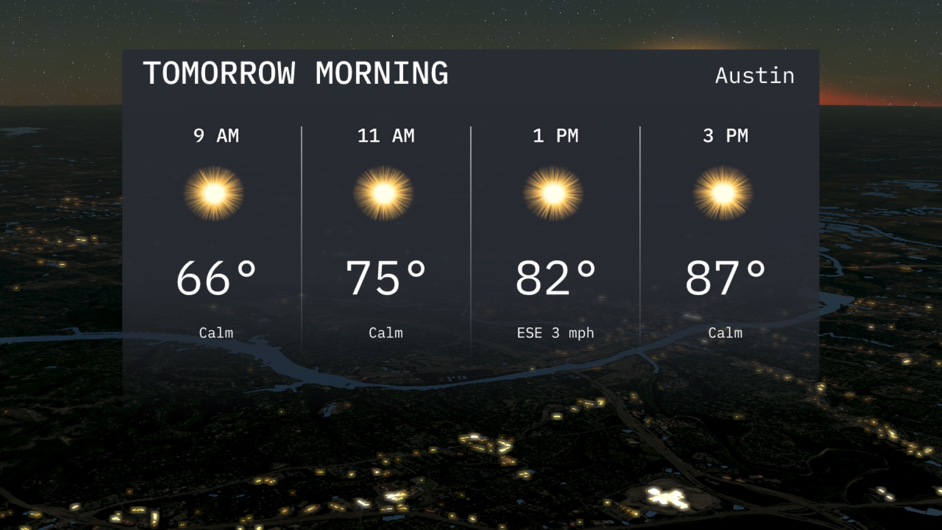 Tomorrow morning in Austin starts off calm with sunny skies and temperatures at 66 degrees by 9 AM. As the morning progresses, the temperature will rise to 75 degrees by 11 AM under continued clear conditions. A slight breeze may develop from the east-southeast.