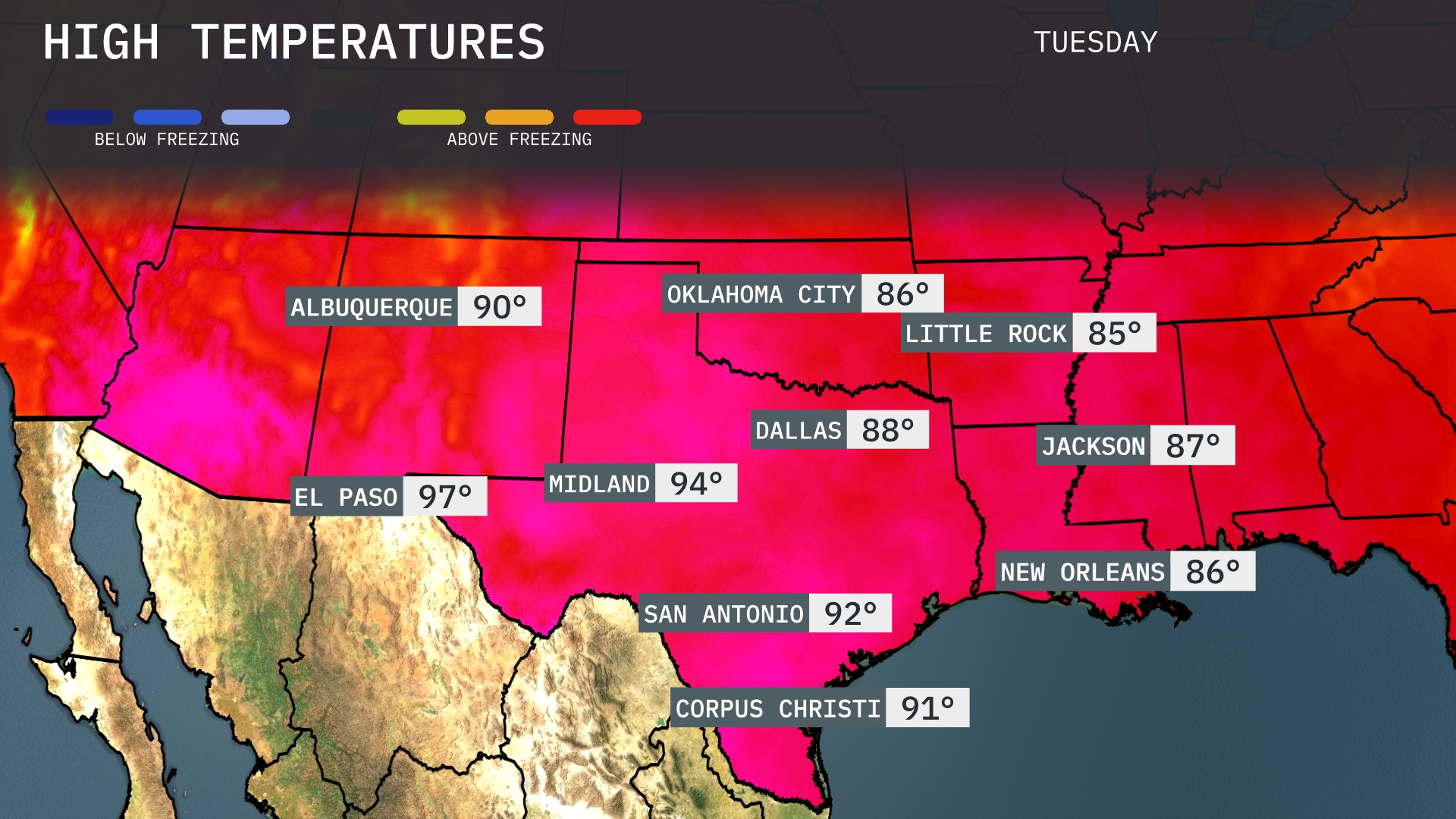 Tomorrow in El Paso, expect a high of 97 degrees, while Midland warms up to a sizzling 94. San Antonio is poised for a high of 92, and Dallas will reach 88 degrees. Over in Oklahoma City, temperatures are forecasted to hit 86, with Little Rock slightly cooler at 85. Jackson is anticipating a high of 87, showing temperatures that are above average for this time of year across much of the Southern Plains.