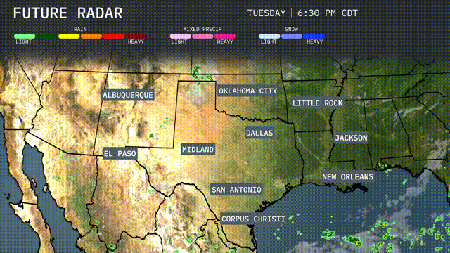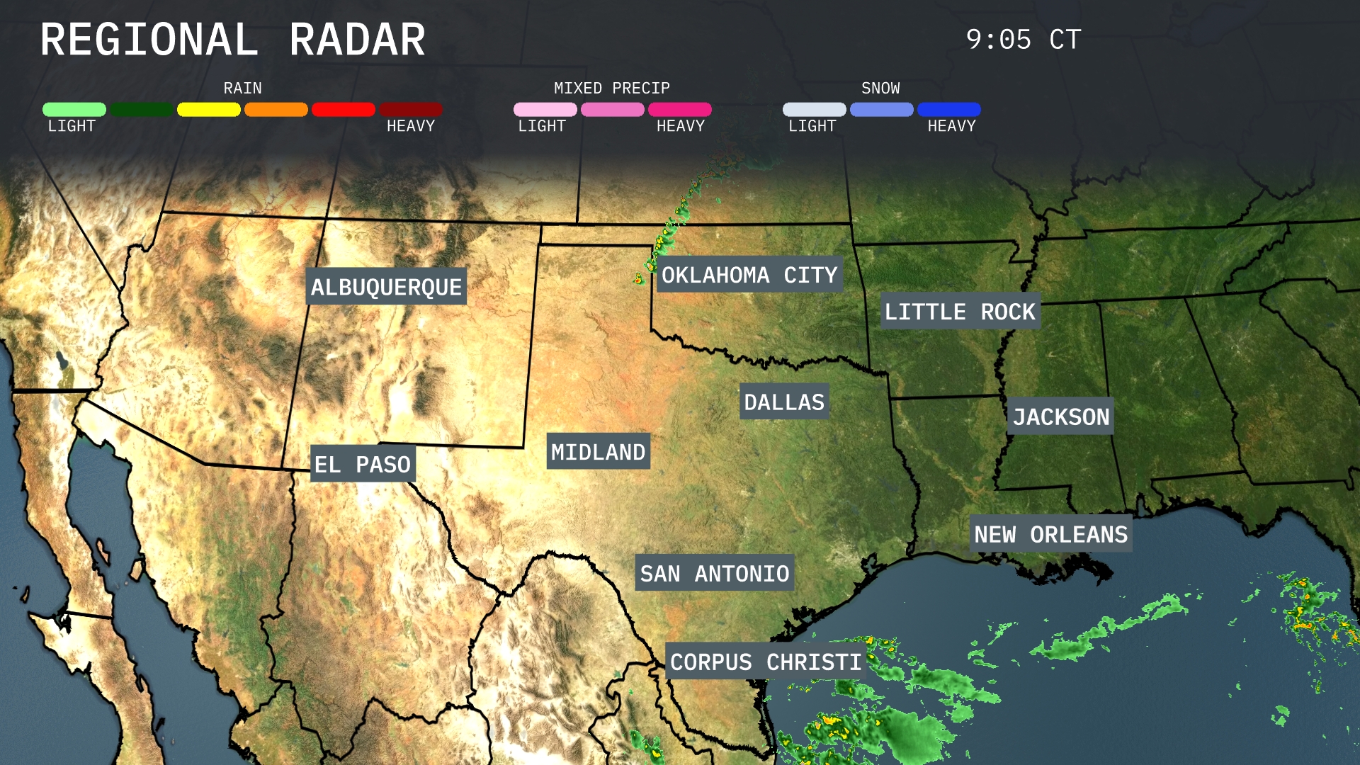 A line of storms is advancing eastward from Oklahoma City, indicating the possibility of severe weather. The showers extend down towards Dallas, where moderate precipitation is evident, and are impacting areas near Midland with light rain. Meanwhile, Corpus Christi is experiencing substantial rain activity moving off the coast. Farther east, scattered rain showers are developing near New Orleans, with potential for more persistent rain in the area.