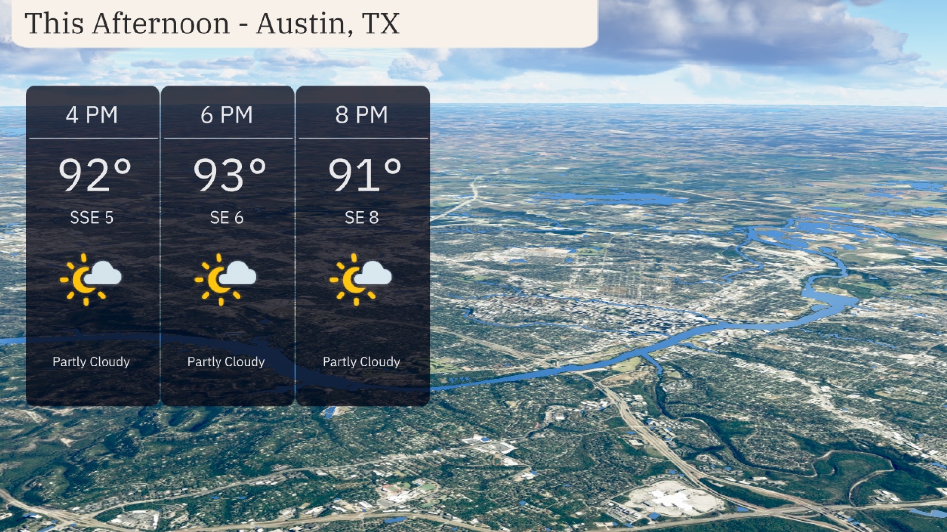 This afternoon in Austin brings partly cloudy skies with temperatures holding steady in the low 90s, reaching up to 93 degrees by 6 PM. A gentle breeze from the southeast ranges from 5 to 8 miles per hour, providing a bit of relief from the warm temperatures.