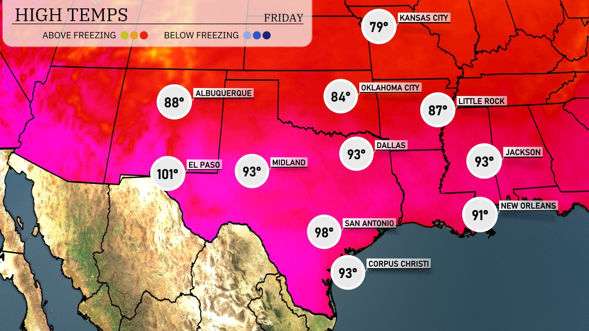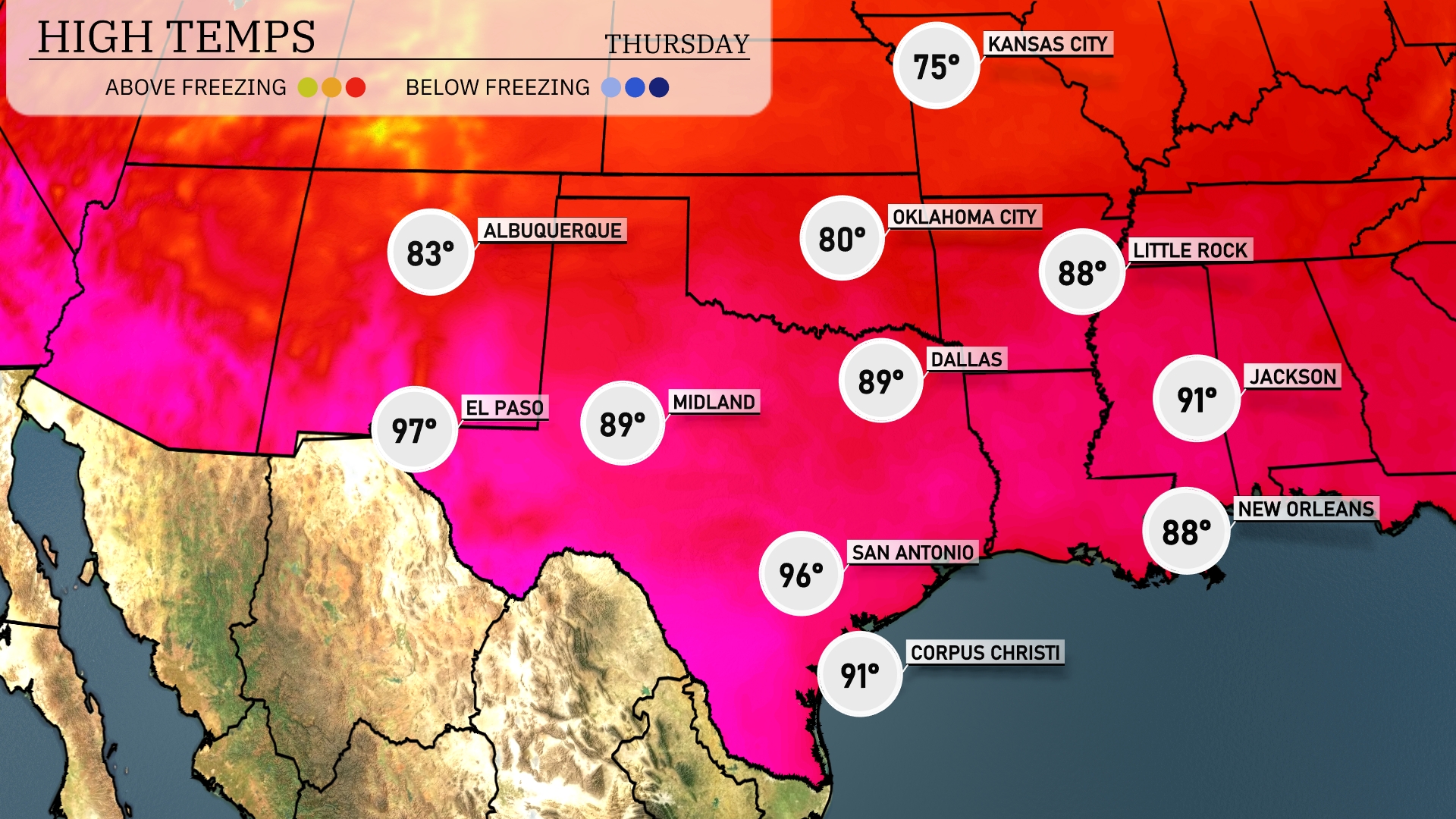 Today, temperatures in the Southern Plains are reaching sizzling highs. In Dallas, expect a high of 89 degrees, while the mercury rises to 97 in El Paso. San Antonio is feeling the heat too, with a high of 96 degrees. Midland matches Dallas at 89 degrees, while Corpus Christi is slightly cooler at 91. In other nearby cities, Jackson will see a warm high of 91 degrees, and New Orleans is looking at a pleasant 88 degrees.