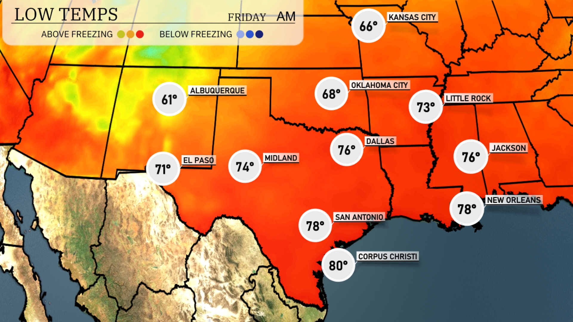 Tonight Dallas will see a low of 76 degrees, while Oklahoma City drops to 68. In contrast, Little Rock is expected to cool down to 73 degrees. El Paso will sit at 71 degrees overnight, and San Antonio will remain warm at 78 degrees.