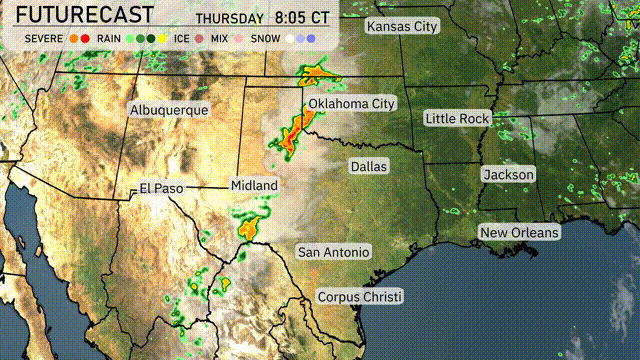On the futurecast for the Southern Plains, thunderstorms are expected to develop rapidly late tonight, particularly around Oklahoma City and extending into Dallas. A cold front is sweeping across the region, which will enhance the potential for severe weather, including strong winds and hail through Thursday afternoon. Rainfall from Midland to San Antonio will provide relief from ongoing dry conditions but could lead to localized flooding due to intense downpours. By Thursday night, temperatures are set to decrease, bringing a cooler air mass into areas from El Paso to Corpus Christi.