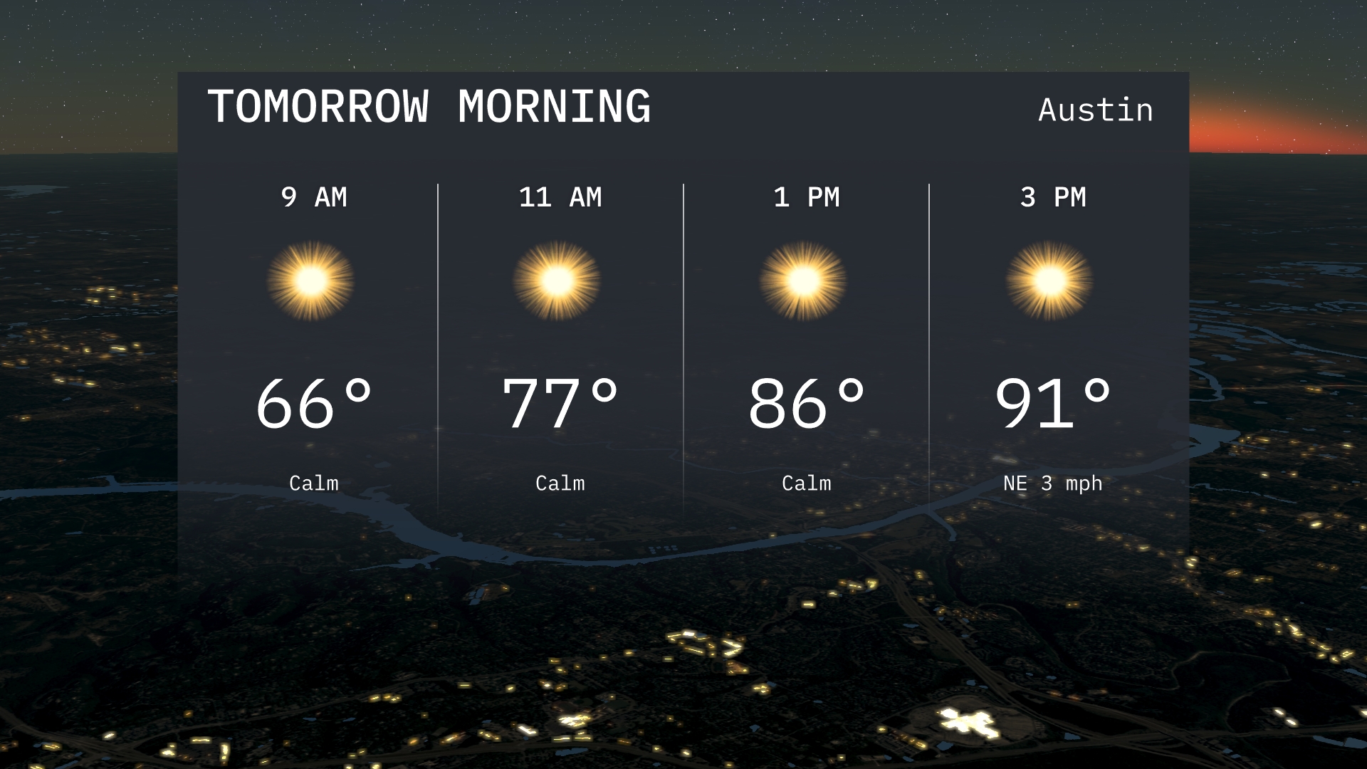 Austin’s morning will begin at 66 degrees by 9 AM with sunshine on the horizon. Temperatures will rise to 77 degrees by 11 AM as the calm conditions continue. Expect clear skies through the morning hours, offering a pleasant start to the day.