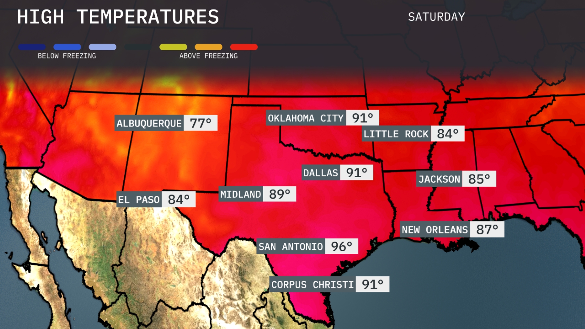 Tomorrow, Oklahoma City is forecasted to reach a high of 91 degrees, while Dallas also sees similar warmth with a high of 91. Midland is trending a bit cooler with a high of 89 degrees. Over in San Antonio, expect a sizzling high of 96, significantly above the average for this time of year. Corpus Christi is predicted to hit 91 degrees, and Jackson rounds out the region with a high of 85.