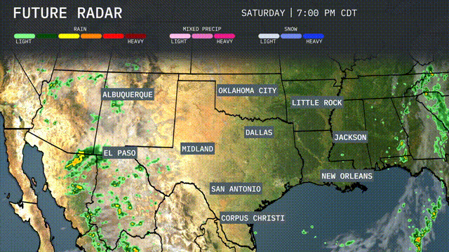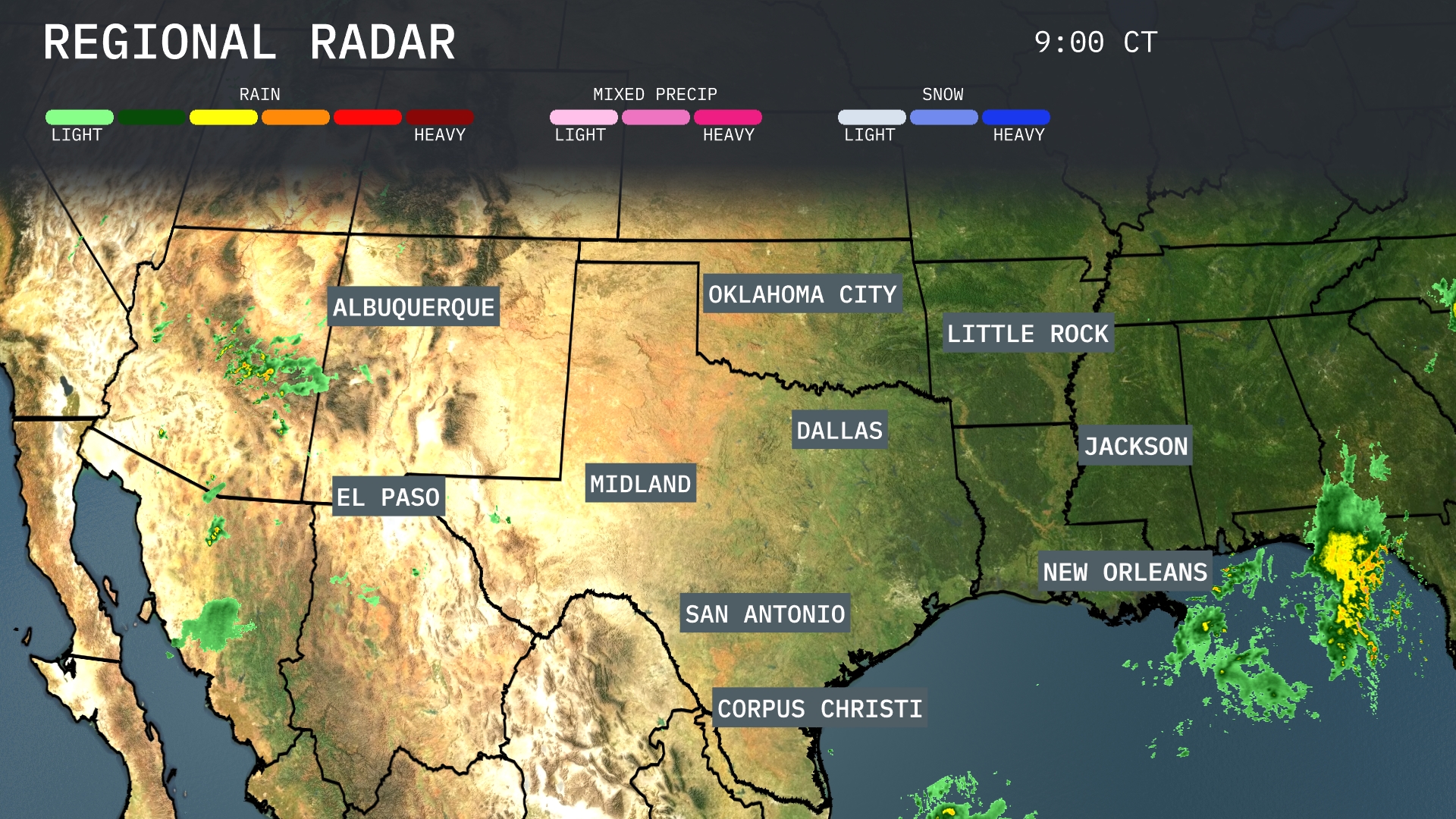 A look at the Southern Plains shows rain intensifying over New Orleans. Shifting west, light showers are impacting El Paso and stretching north toward Albuquerque. Skies remain clear across Dallas and Oklahoma City. There are some storms developing over Jackson, moving eastward into the surrounding areas.