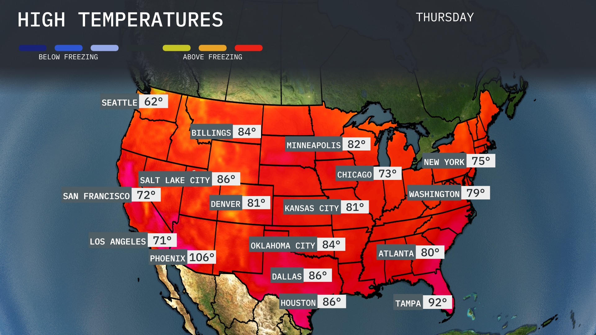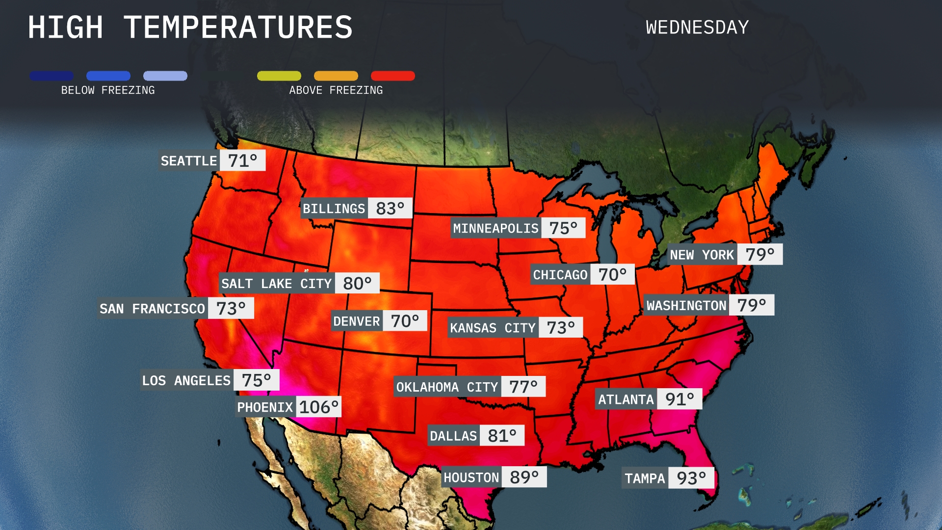 Today, the Southwest is ablaze with Phoenix reaching a scorching 106 degrees, making it the hottest spot in the nation. Meanwhile, Dallas enjoys slightly more moderate conditions at 81 degrees, with Houston not far behind at 89. Over in the Southeast, Atlanta is steamy at 91 degrees, while Tampa balances the warmth with a high of 93. In contrast, the Midwest remains cooler, with Chicago only reaching 70 degrees, highlighting a significant temperature divide across the country.