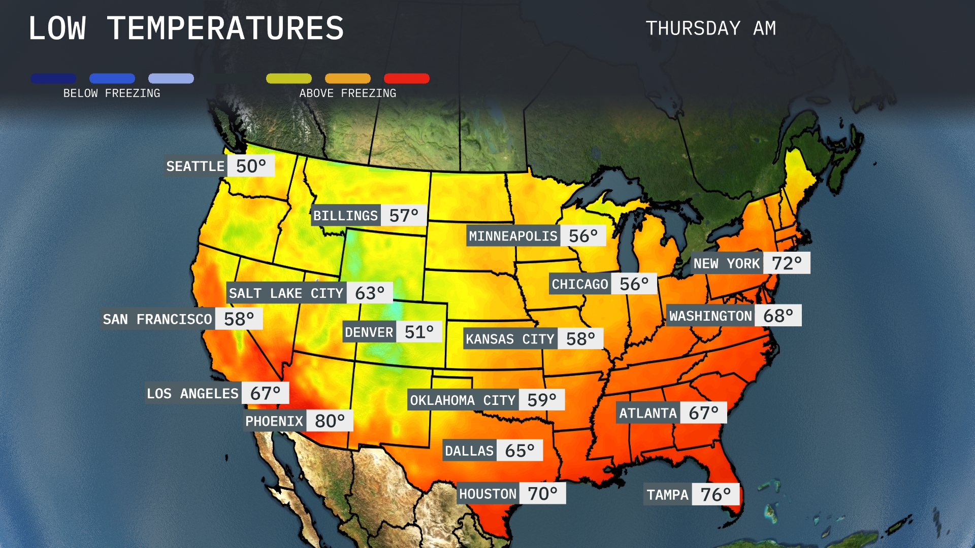 Now for the low temperatures tomorrow morning across the U.S. Expect a brisk 56 degrees in Chicago, while Minneapolis dips slightly lower to 54. Heading south, Kansas City will see a low of 58 degrees, and Dallas remains milder at 65. On the warmer side, New York starts the day at 72 degrees, while the Southeast, including Atlanta, will wake up to 67 degrees.