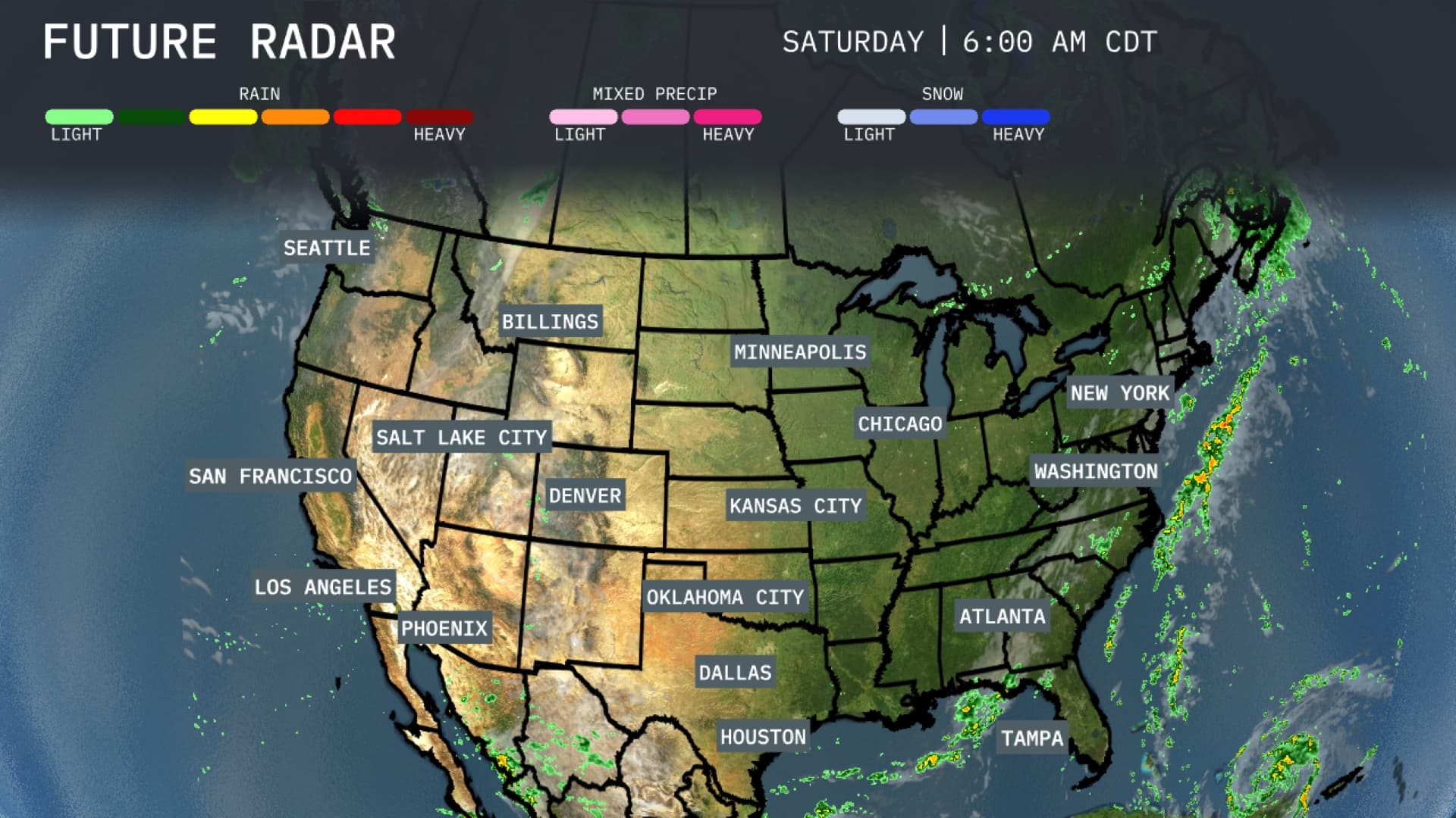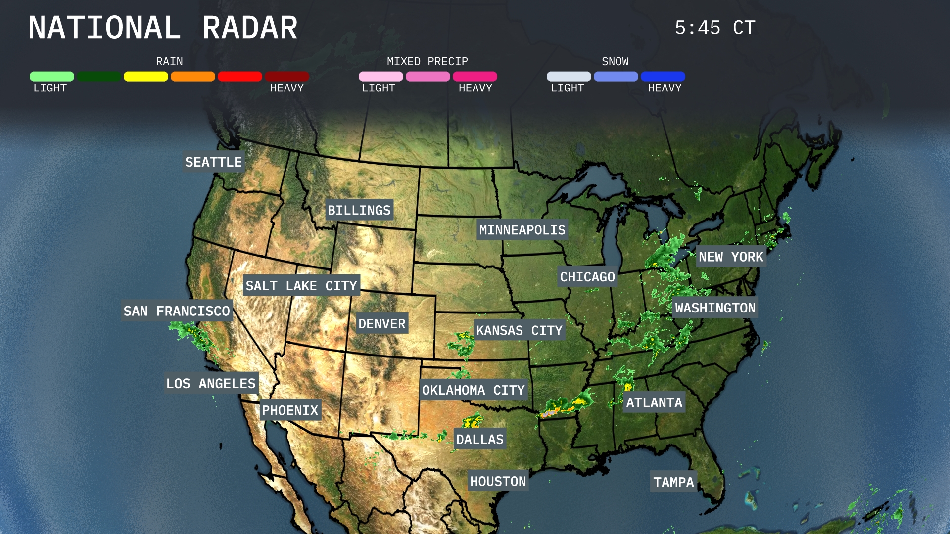 A robust band of storms is sweeping across the Southern Plains, with Dallas and Oklahoma City experiencing intense rainfall, leading to potential flooding concerns in the area. Meanwhile, light showers are extending farther east, affecting Atlanta on the Southeast Coast. The heaviest rain impacts the Mid-Atlantic, where Washington, D.C., faces significant precipitation complicating travel plans. In the West, cities like Seattle and Los Angeles enjoy calm conditions under clear skies, providing a pleasant weather contrast to those more storm-prone regions today.