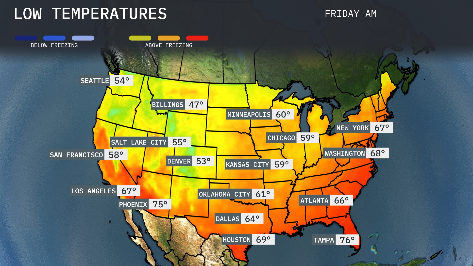 Now for the low temperatures tomorrow morning across the U.S. The northern plains will feel a chill, with Minneapolis dropping to 60 degrees and Chicago at 59. Moving to the central region, Kansas City will see a low of 59 degrees as well, while farther south in Dallas, temperatures will be mild at 64 degrees. In the Southeast, Atlanta starts the day at 66 degrees, with New York and Washington, D.C. both waking up to 67 and 68 degrees, respectively.