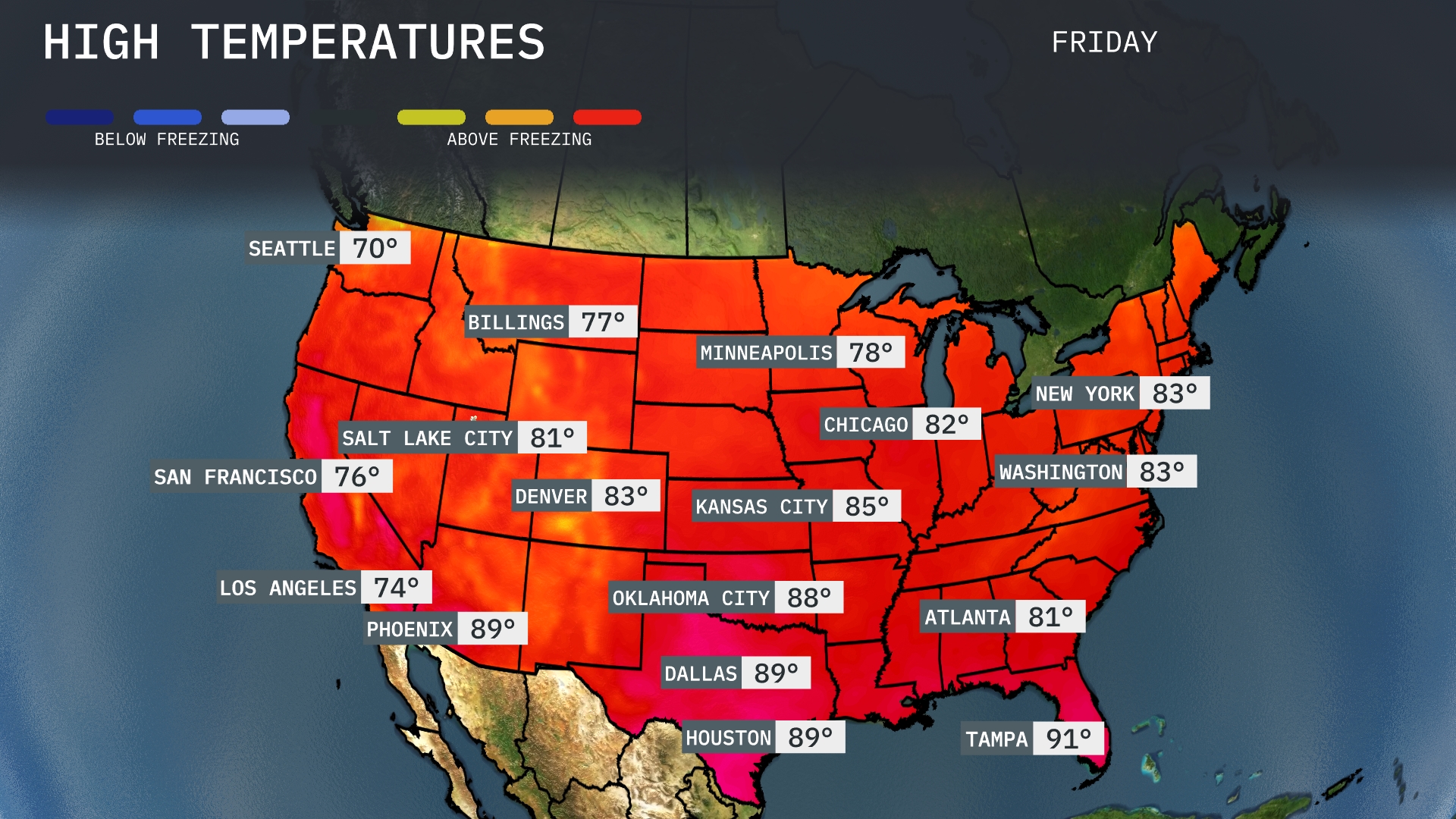 Tomorrow, we can expect warm temperatures across the Southeast, with Dallas and Houston both reaching 89 degrees, reflecting above-average conditions for this time of year. Atlanta will enjoy a pleasant high of 81 degrees, while farther south, Tampa is forecasted to hit 91 degrees, marking a notable spike. In the Central Plains, Oklahoma City will warm up to 88 degrees, contributing to the overall warmth in the region. Meanwhile, Chicago stays slightly cooler at 82 degrees but still maintains a warm trend.