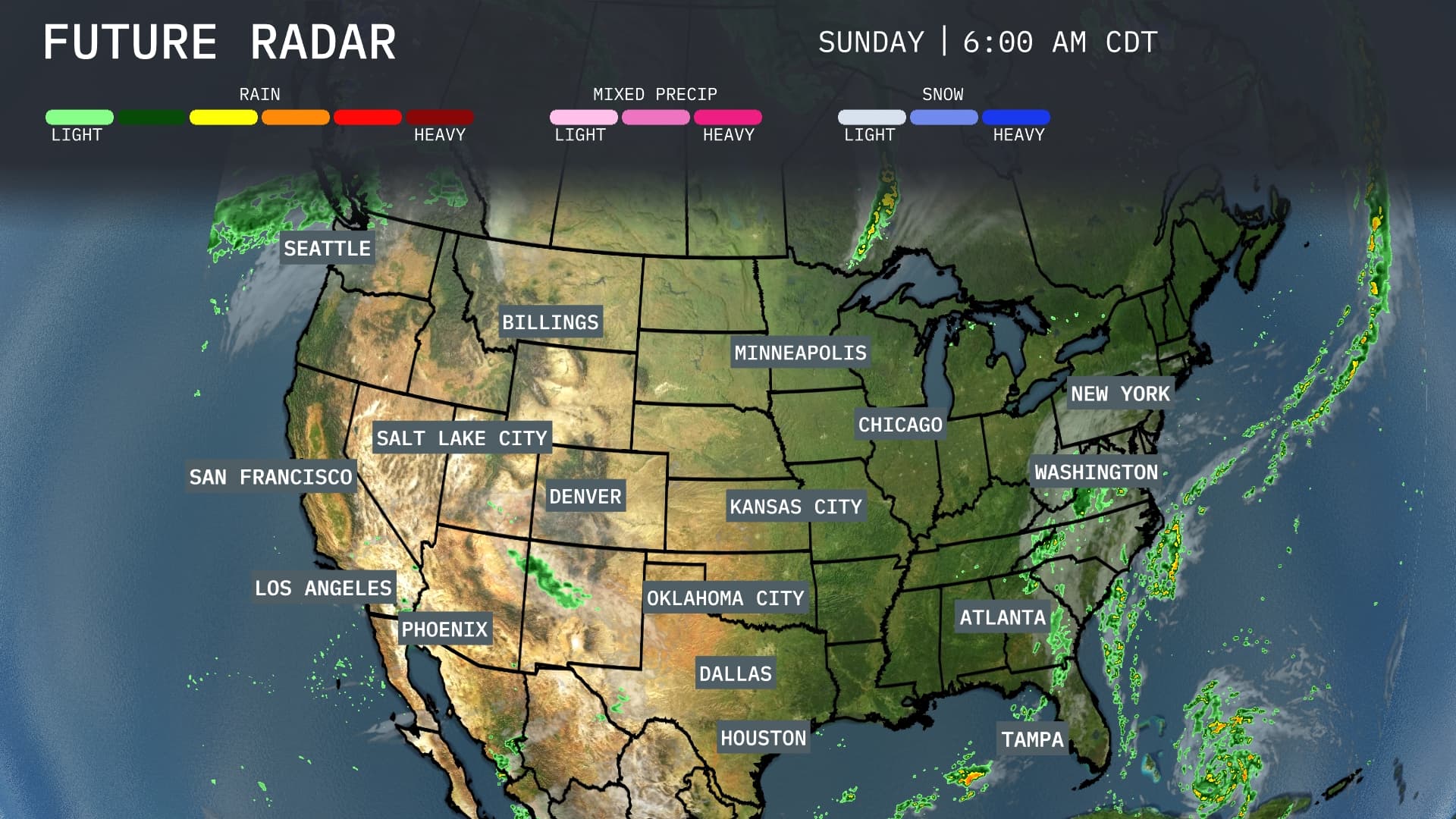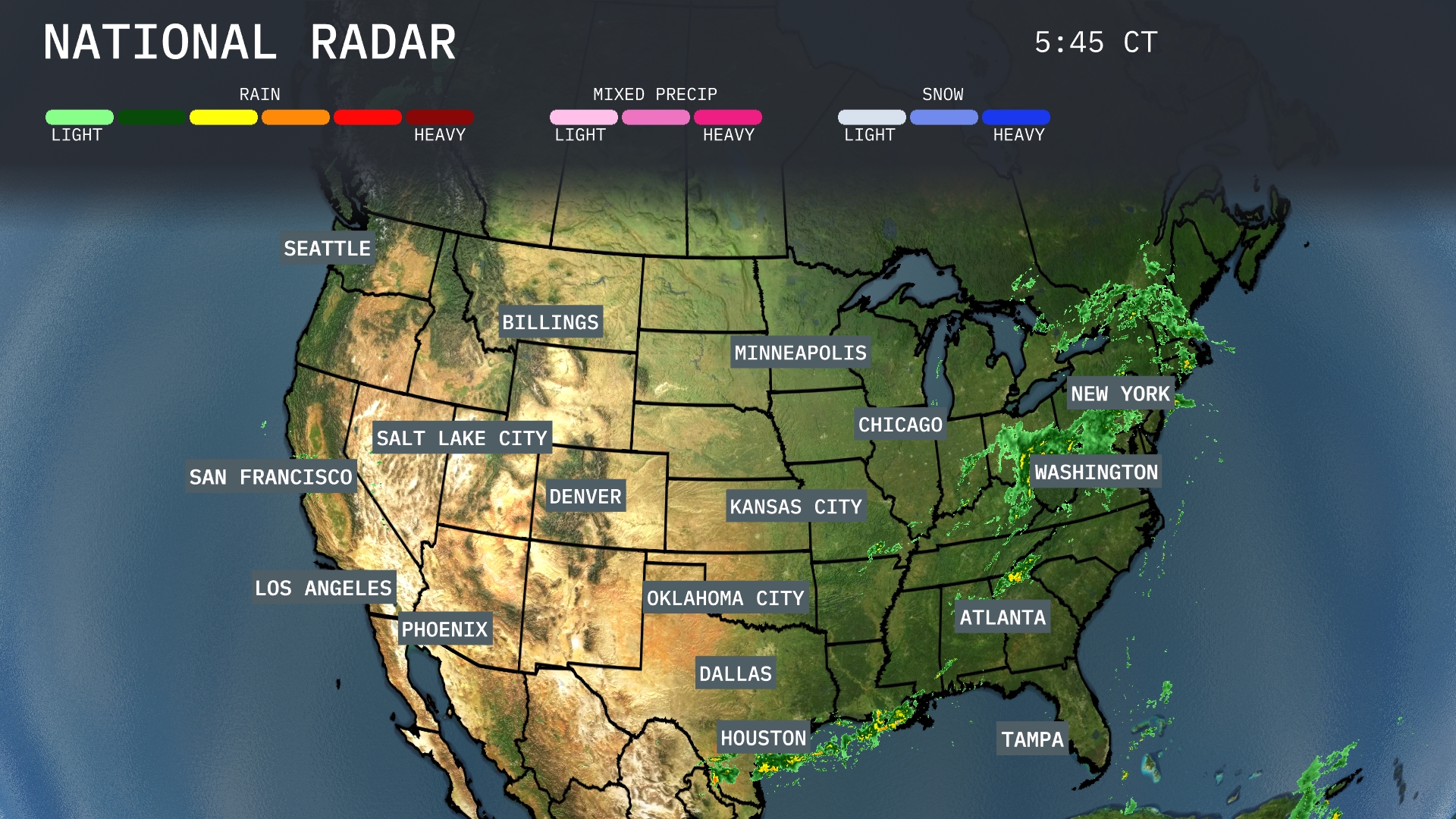 A swath of rain stretches from the Northeast down to the Southeast. New York and Washington, D.C. are facing steady showers, which could affect travel plans. In the Southeast, Atlanta is also in the path of rain, while Tampa is bracing for heavier pockets of precipitation. The central and western regions, including Dallas, Houston, Denver, and Seattle, enjoy clear skies with no significant weather disturbances in sight.