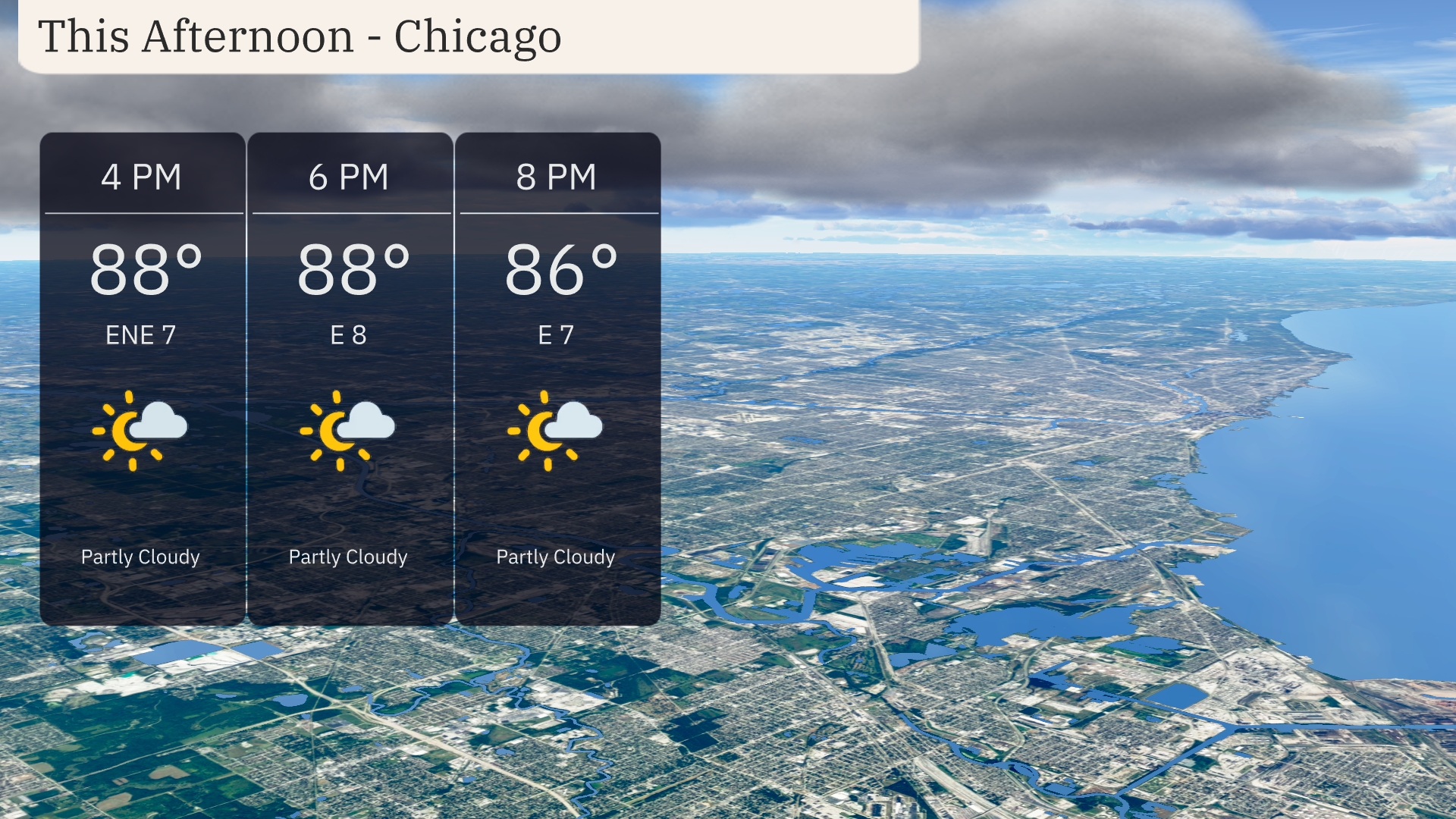 Chicago’s afternoon sees temperatures holding steady at 88 degrees, with an east-northeast wind of 7 mph. Partly cloudy skies will persist throughout the afternoon, offering a mix of sun and clouds. Temperatures begin to ease slightly by evening, dipping to 86 degrees with the wind shifting to an easterly direction at 7 mph.